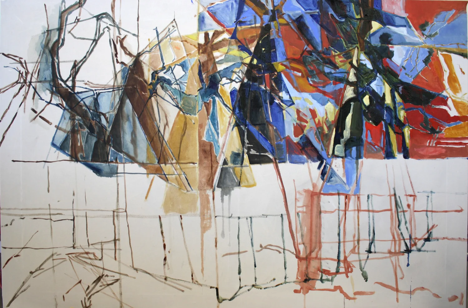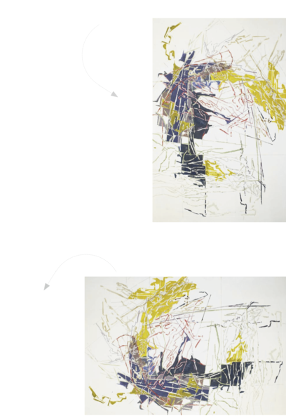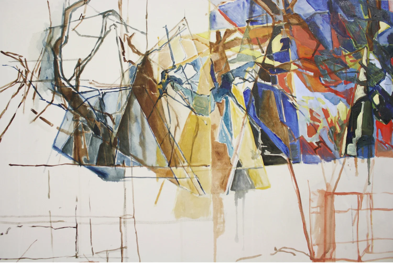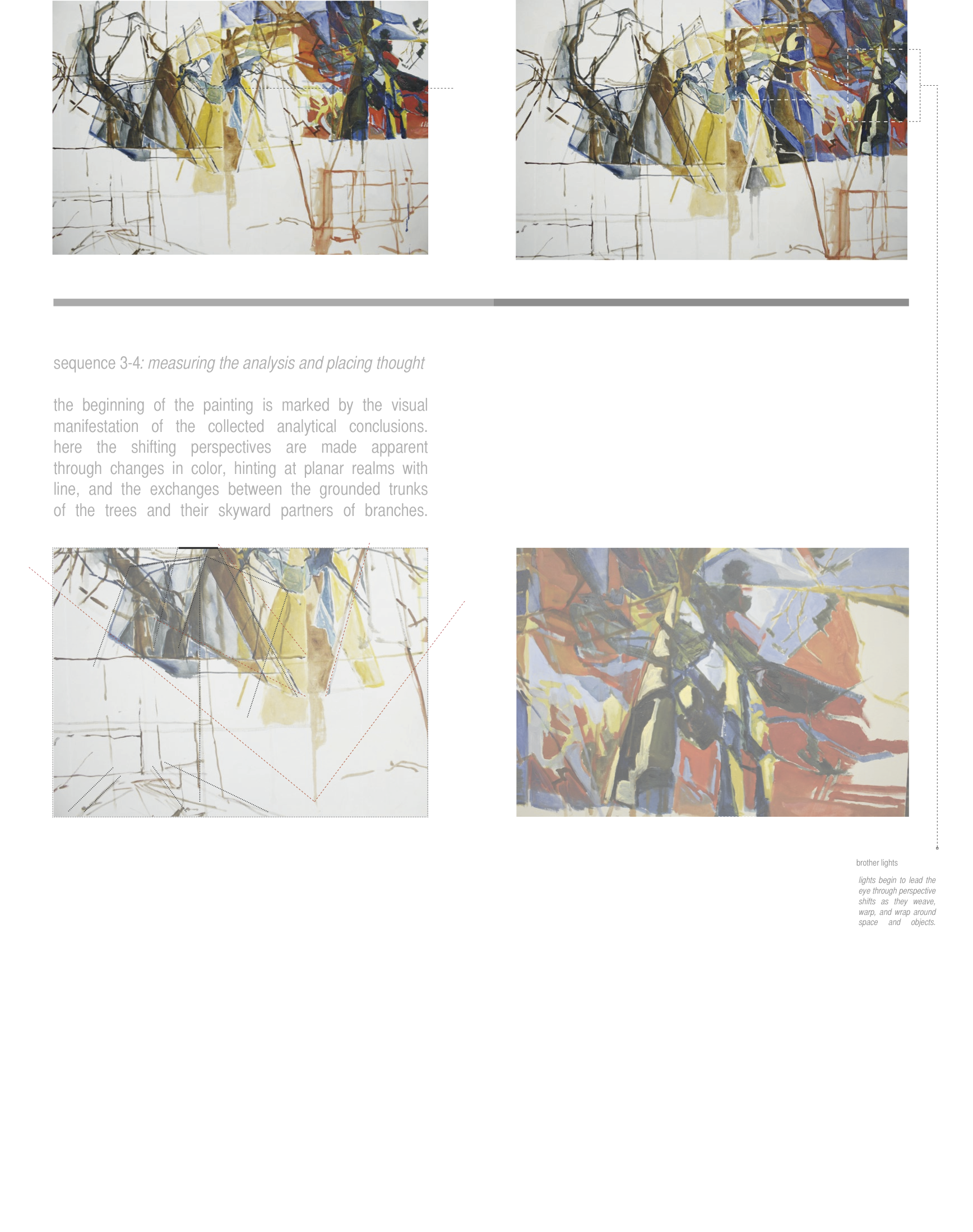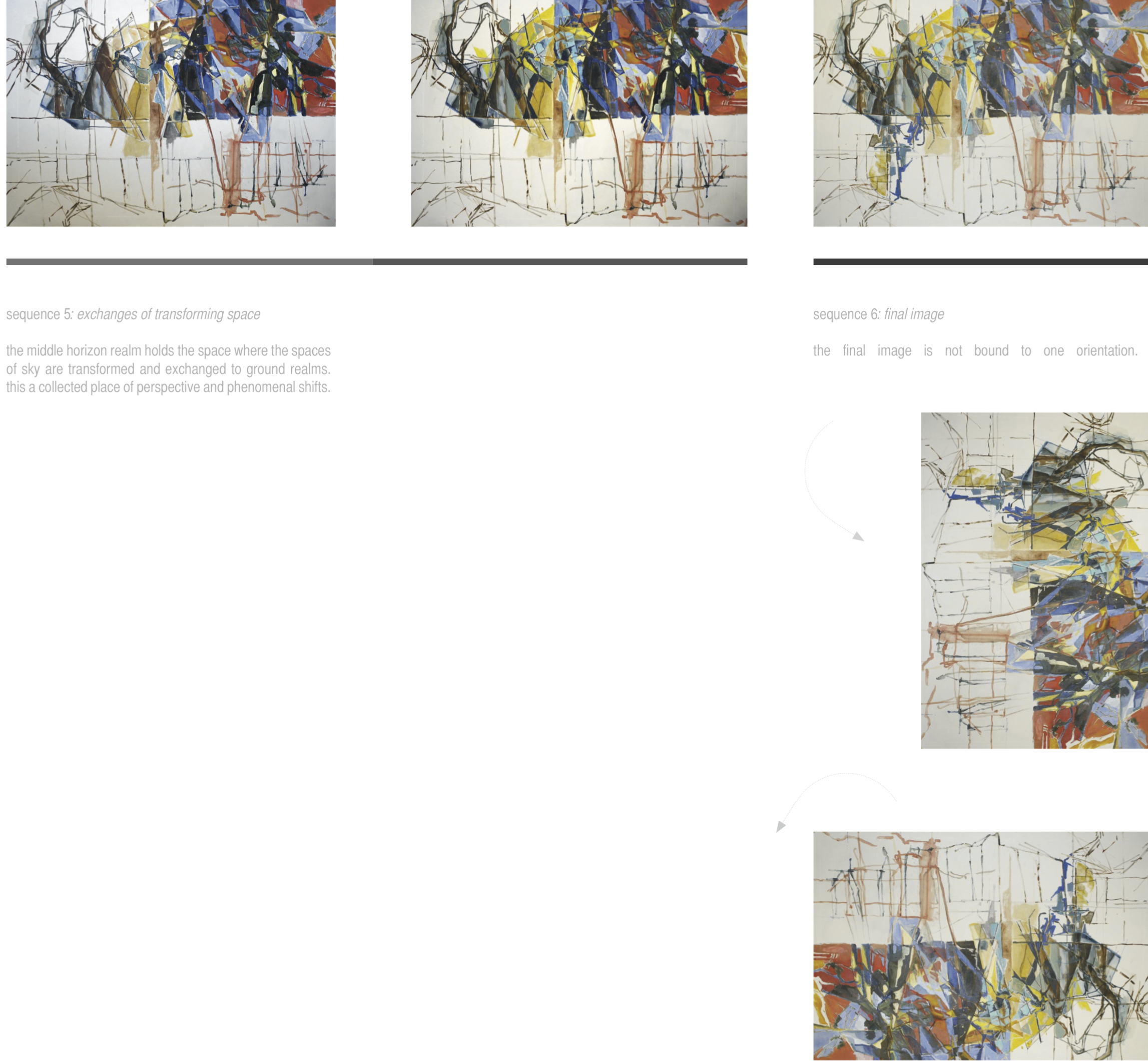 sequence [3-4] measuring the analysis and placing thought the beginning of the painting is marked by the visual manifestation of the collected analytical conclusions. here the shifting perspectives are made apparent through changes in color, hinting at planar realms with line, and the exchanges between the grounded trunks of the trees and their skyward partners of branches