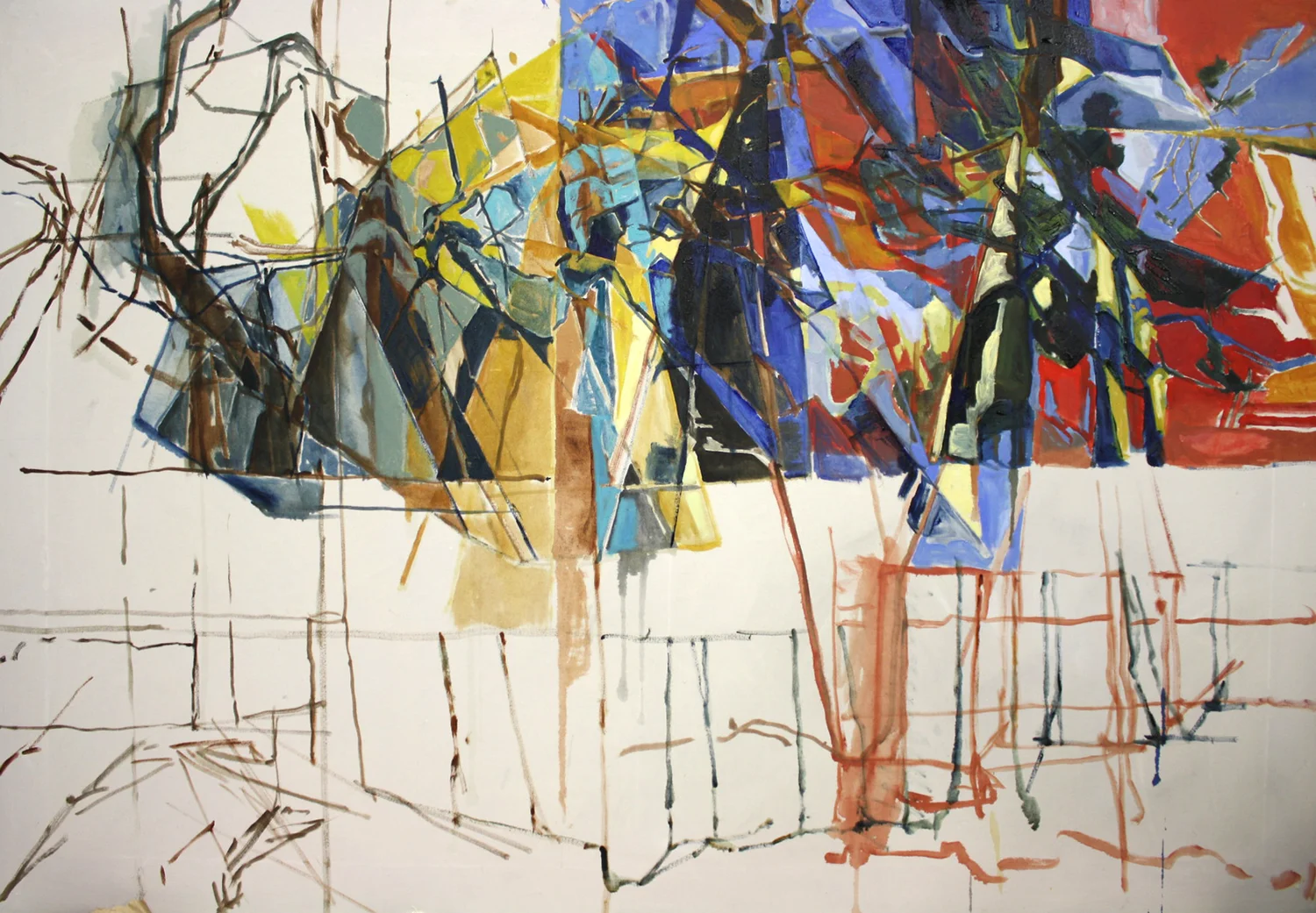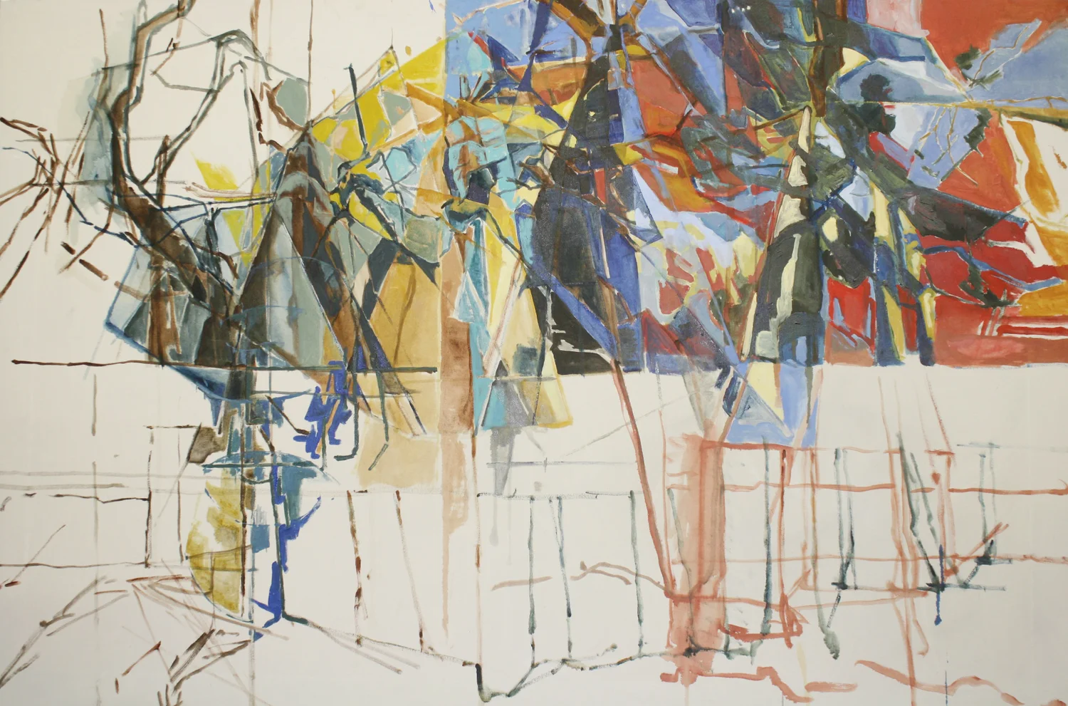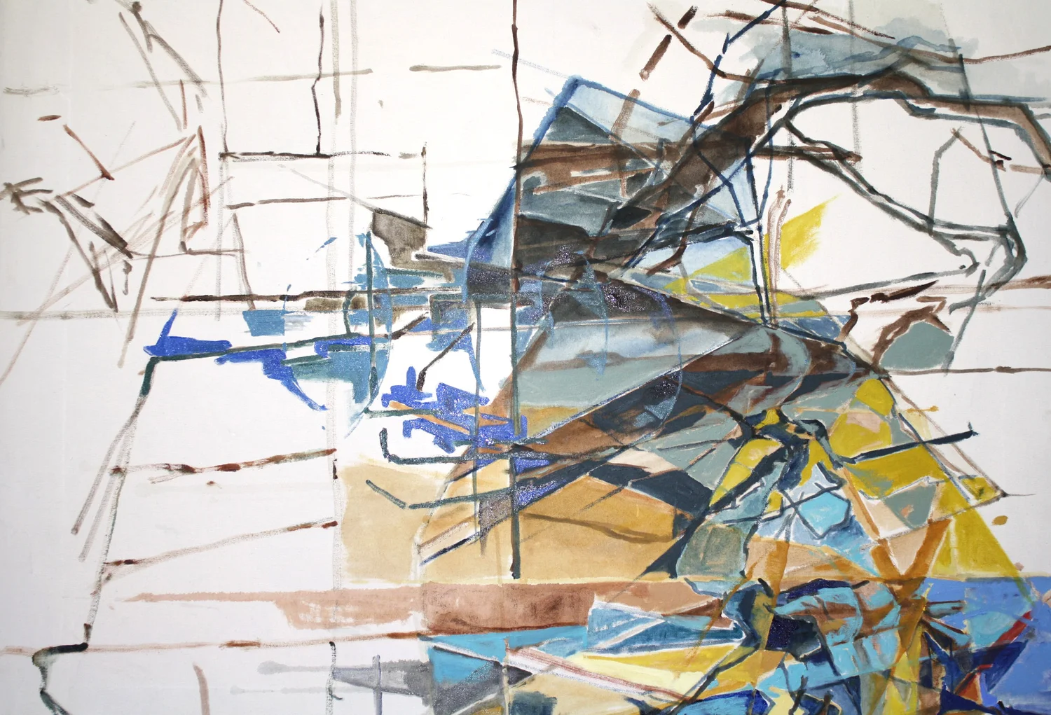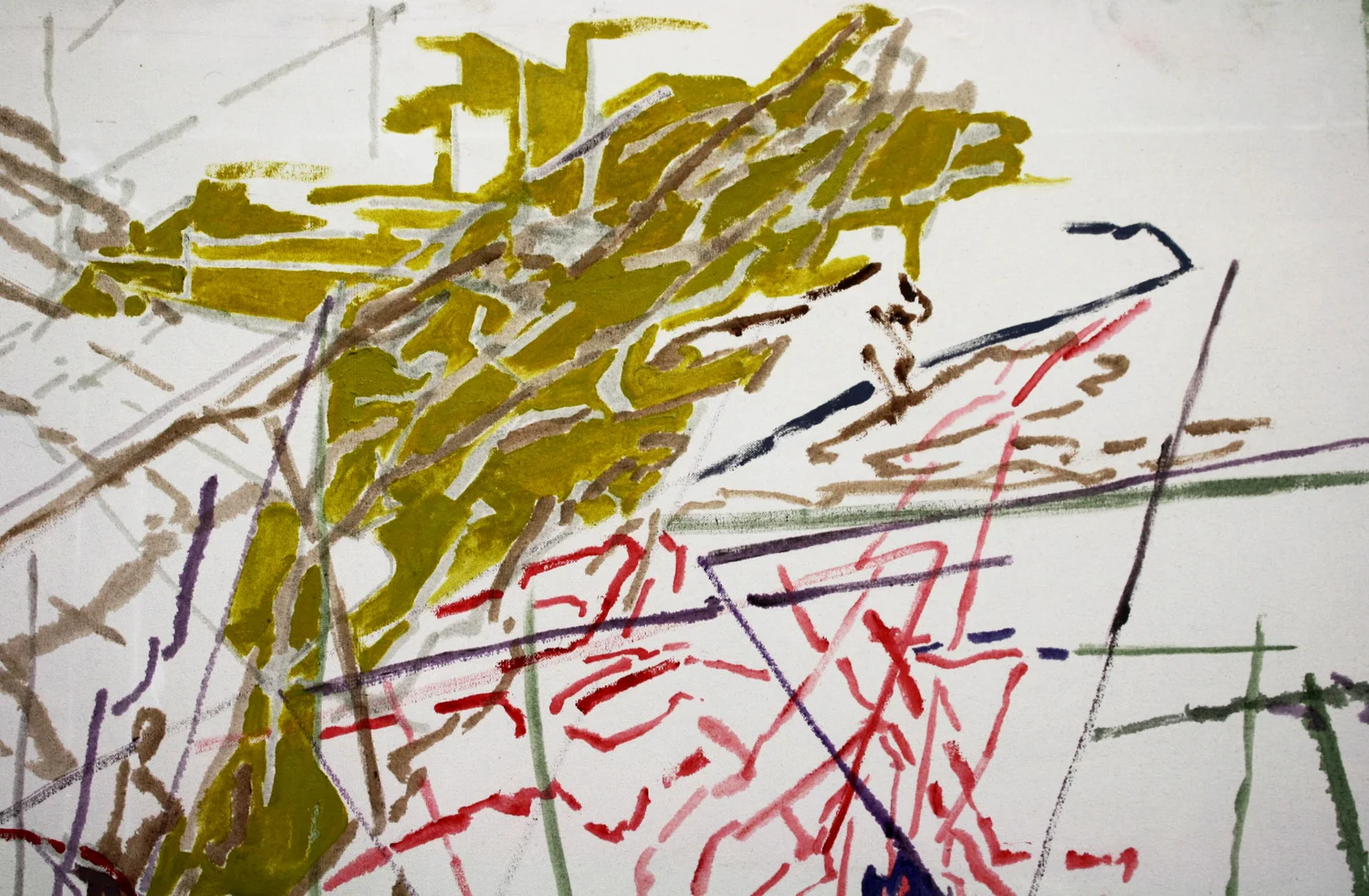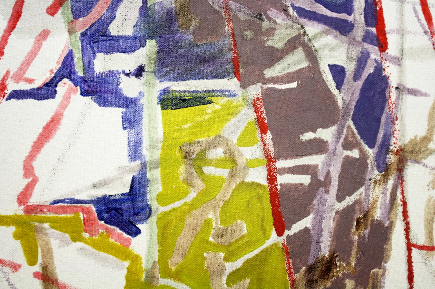sequence [3-4] measuring the analysis and placing thought the beginning of the painting is marked by the visual manifestation of the collected analytical conclusions. here the shifting perspectives are made apparent through changes in color, hinting at planar realms with line, and the exchanges between the grounded trunks of the trees and their skyward partners of branches