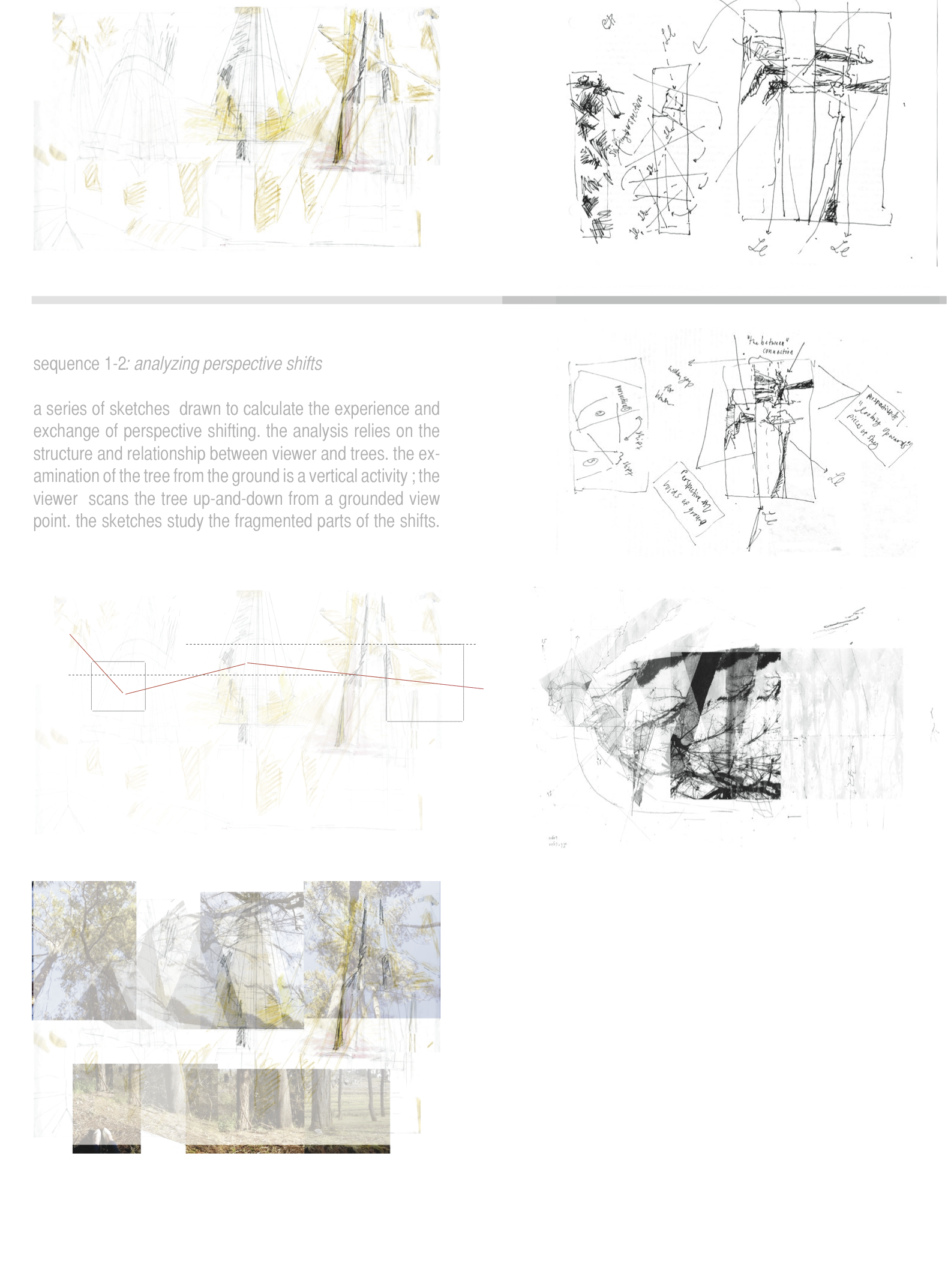 a series of sketches drawn to calculate the experience and exchange of perspective shifting. the analysis relies on the structure and relationship between viewer and trees. the ex- amination of the tree from the ground is a vertical activity ; the viewer scans the tree up-and-down from a grounded view point. the sketches study the fragmented parts of the shifts