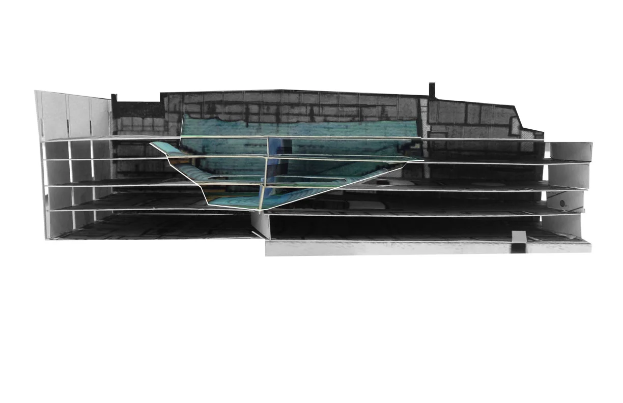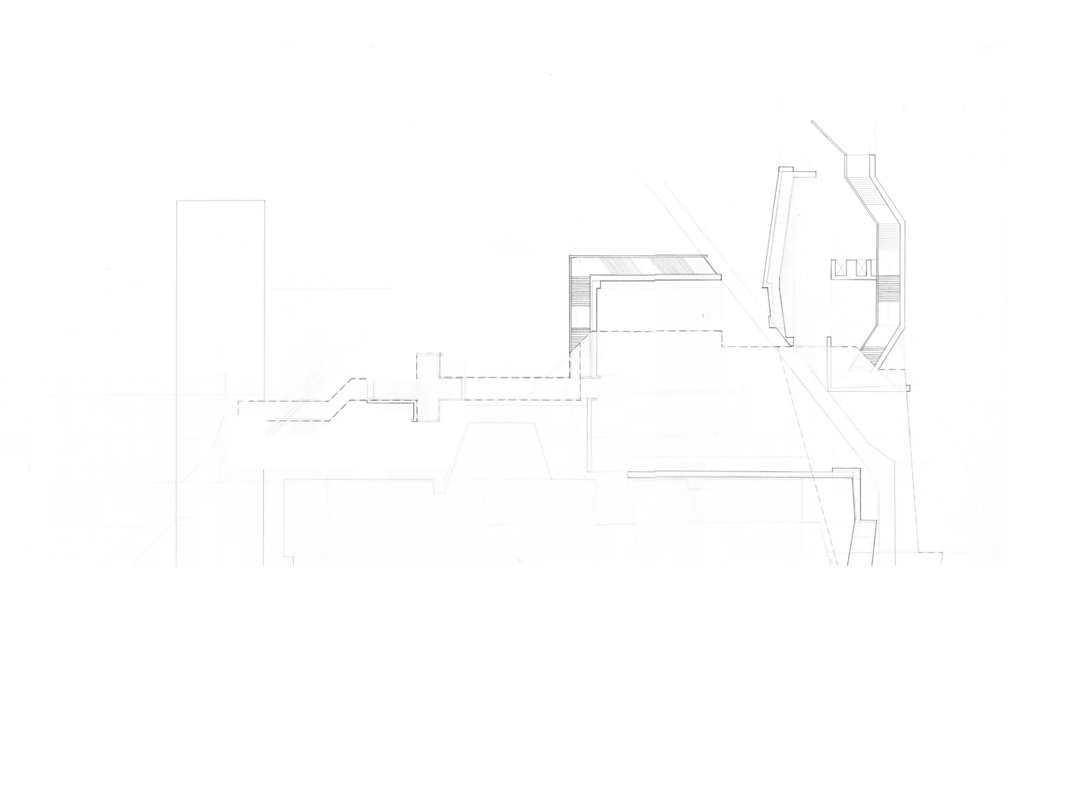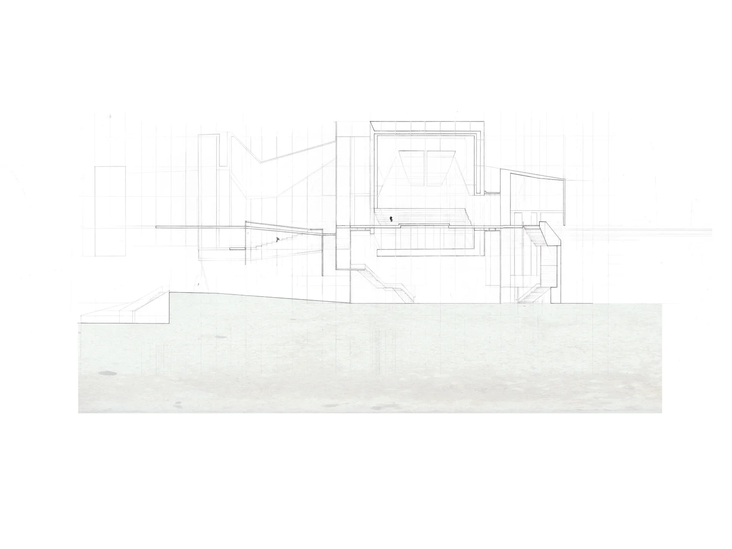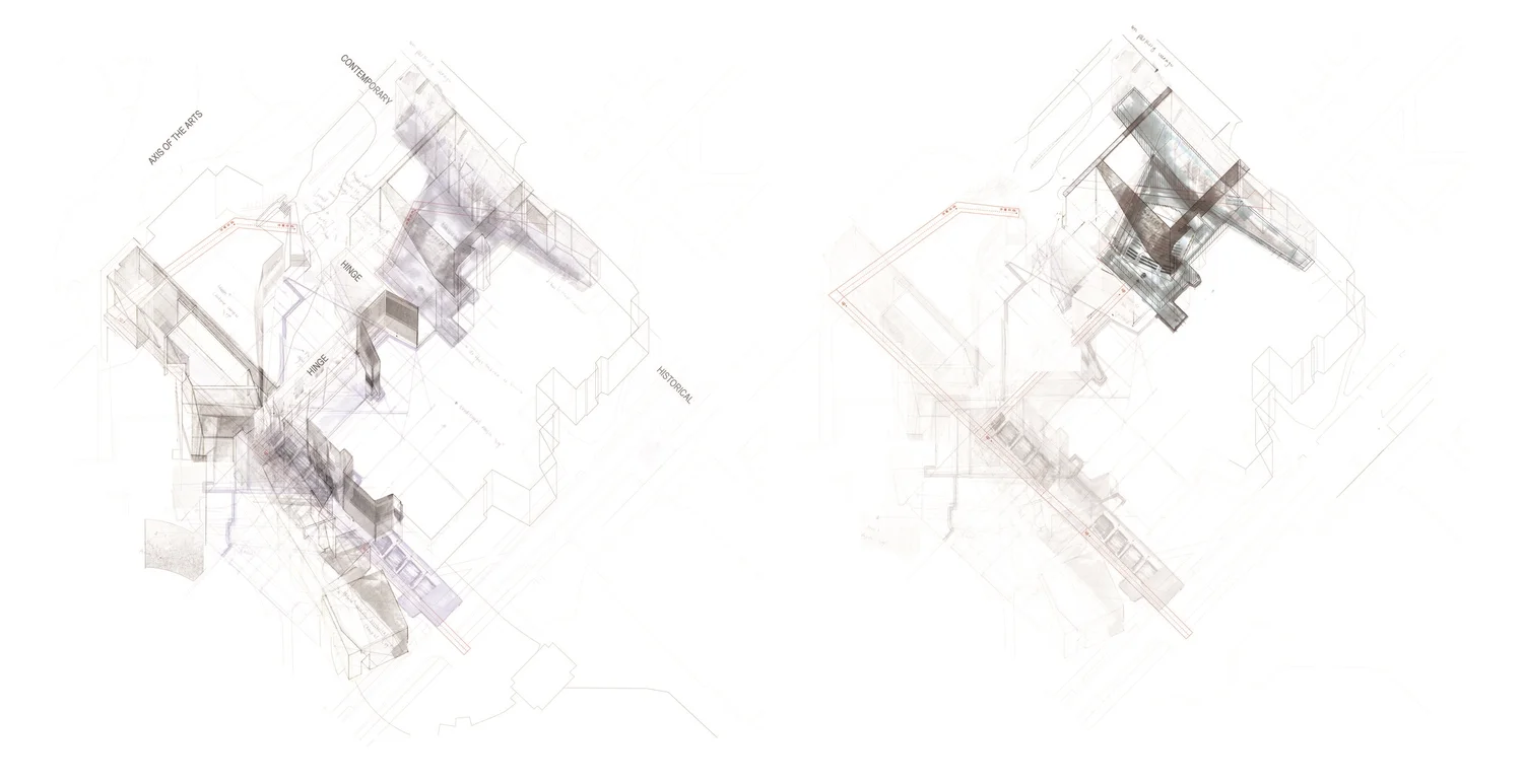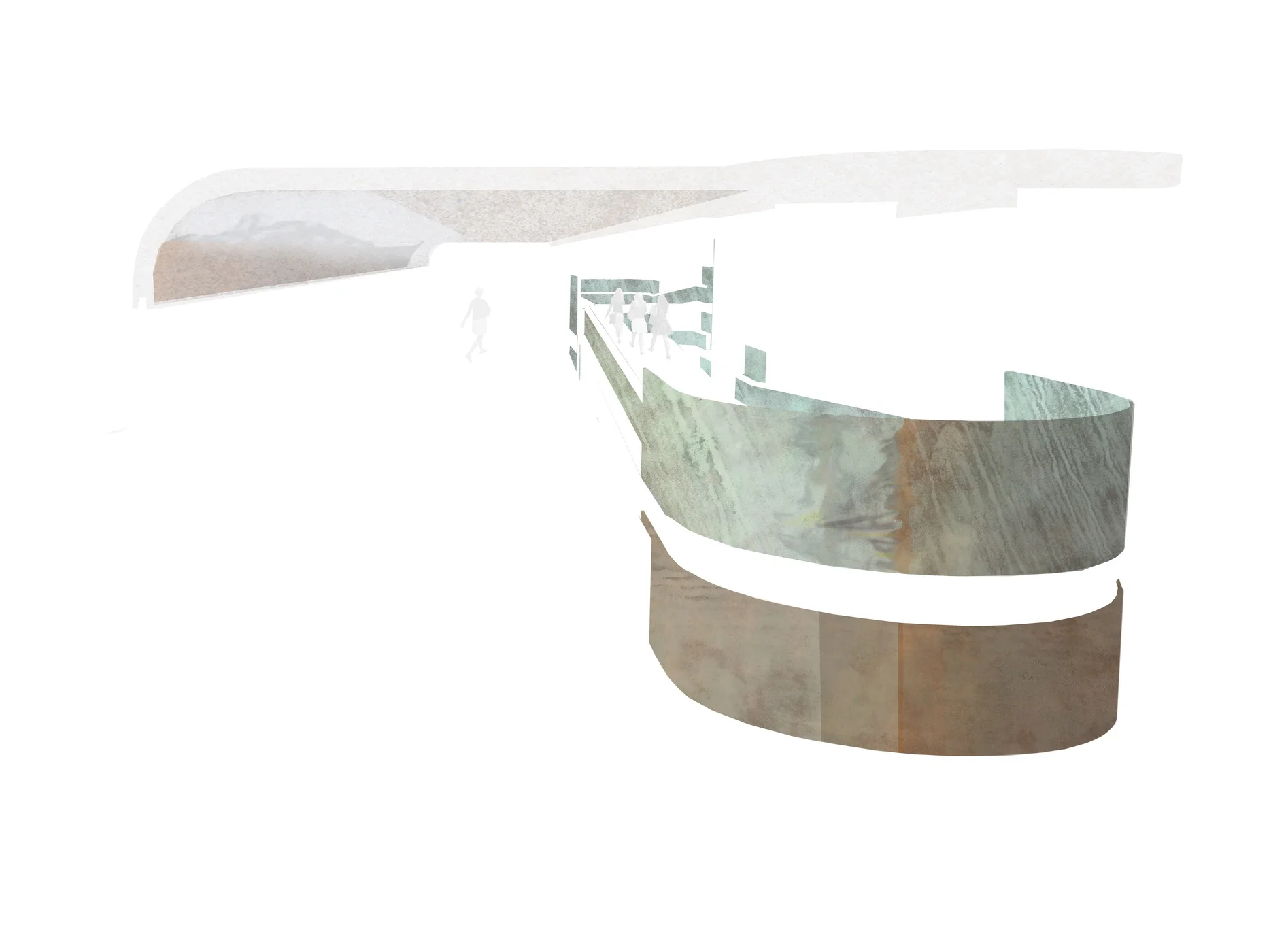 the walls are designed specifically for art. art requires special, controlled lighting. therefore the walls of the galleries are designed with light pathways and light pauses. light pathways are slits at the ceilings and floors that bring light across these areas, wrapping around walls and marking the ceiling with specific shadows. light pauses are found at the places where occupants sit and intimately contemplate art and at window views of the surrounding city.