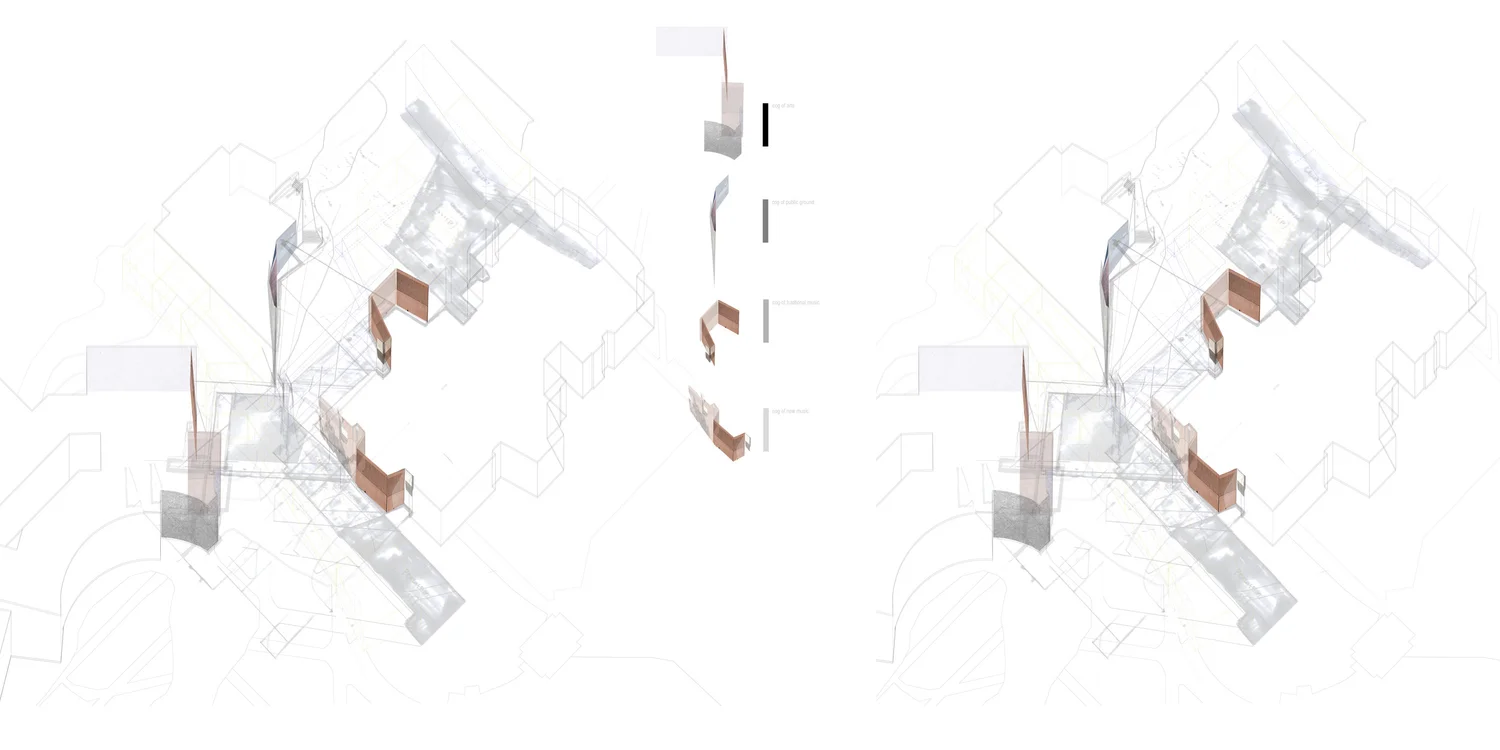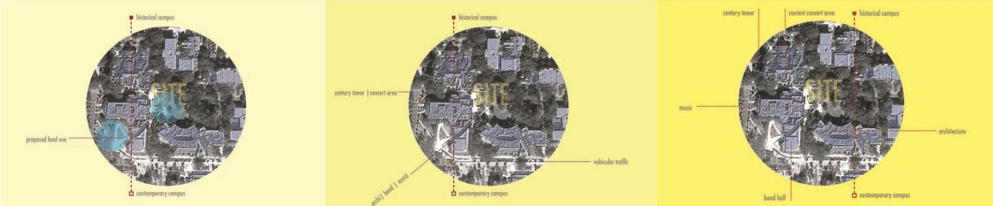 the proposed addition to the music school will extend its program further to the outreach of the urban realm. providing a concert and recital hall allows for the promotion of the arts into the community at a high level of perception and reception. the location of the pro-posed sight is accessible to the band hall and the current location of the music hall. it also extends itself to the edge of the architecture and fine arts facilities. the provides the opportunity for an archi-tectural conversation between the programs, pedestrians, and the coexistence and collaboration of creative fields and interactions. it also serves as the hinge between the historical and contemporary components of campus.
