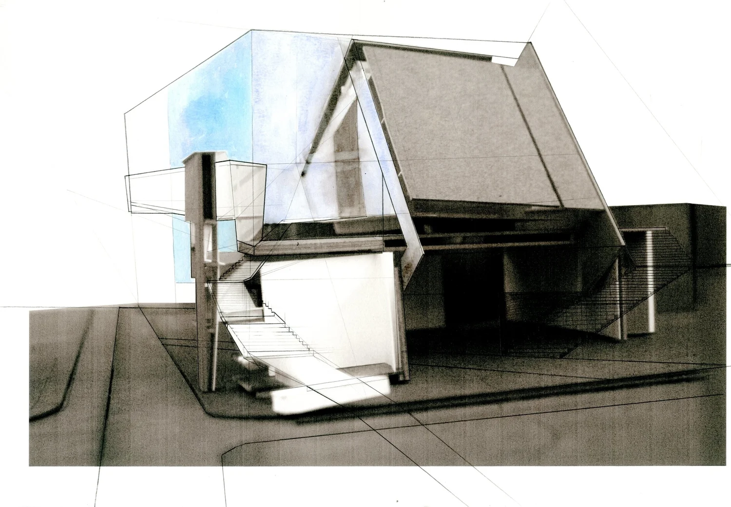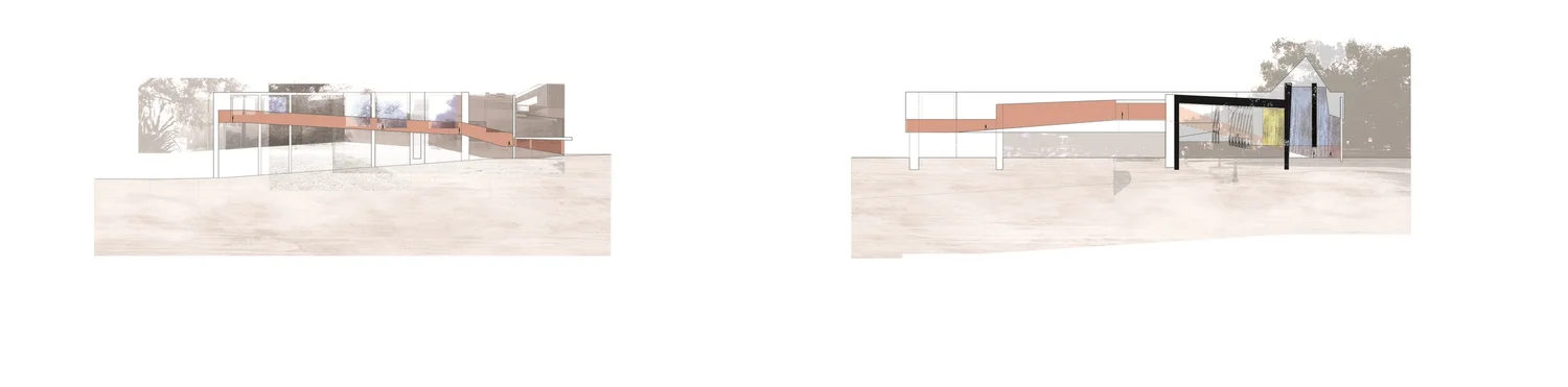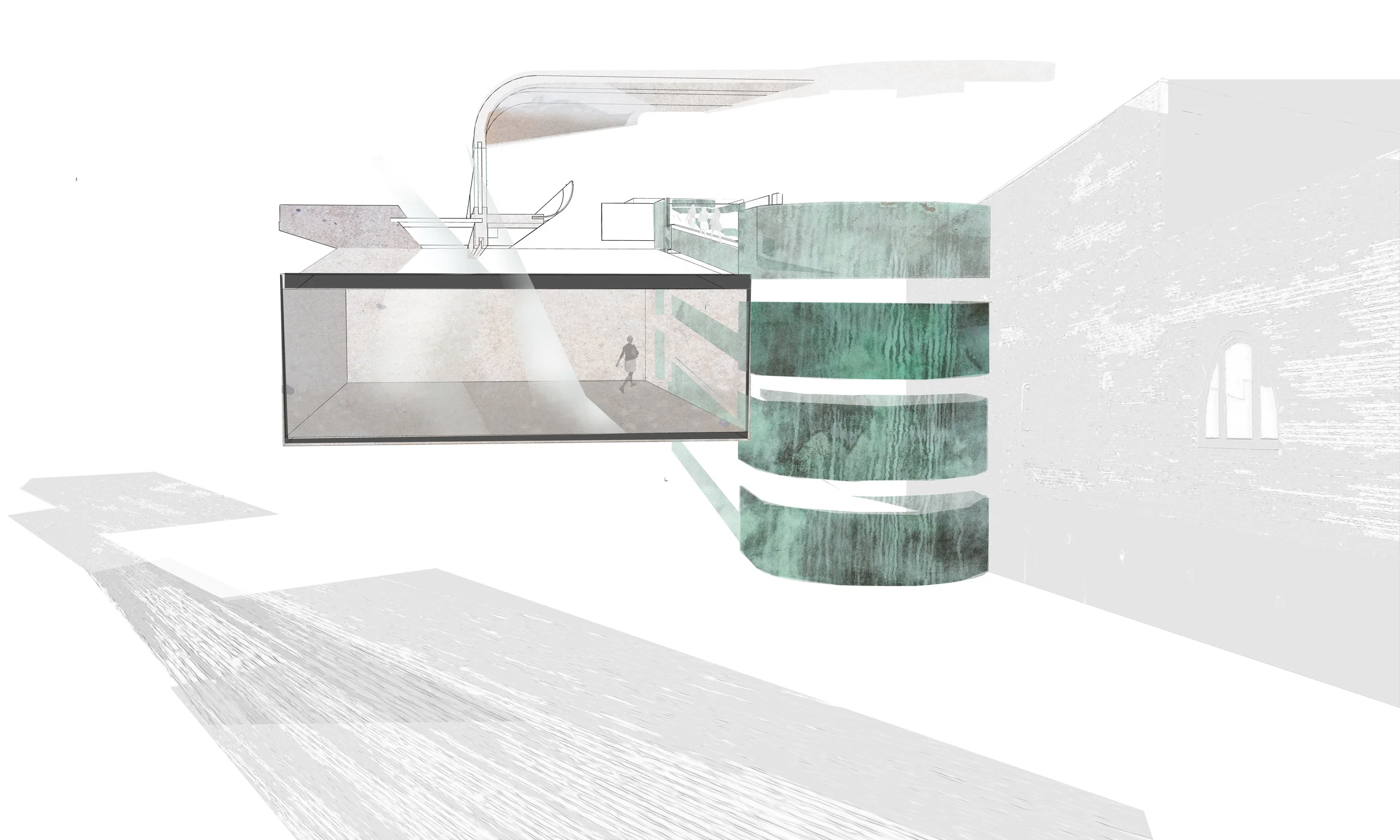 the project proposed is a small art museum in Charleston. the museum is approximately 20,000 square feet. it is located along one of the alleyways that marks the pedestrian paths of the city. the museum is lifted to keep the passage of the alley open for pedestrian traffic and also to provide a shaded courtyard of public use. because Charleston has a warm climate, and summers are extremely warm, shade is a welcomed use of public space. the entrance to the museum is a series of ramps that slowly progress the visitor into a total immersion into art by allowing slight views through glass panels, as the viewer moves through, glimpses of the city are countered by hinted moments of art.