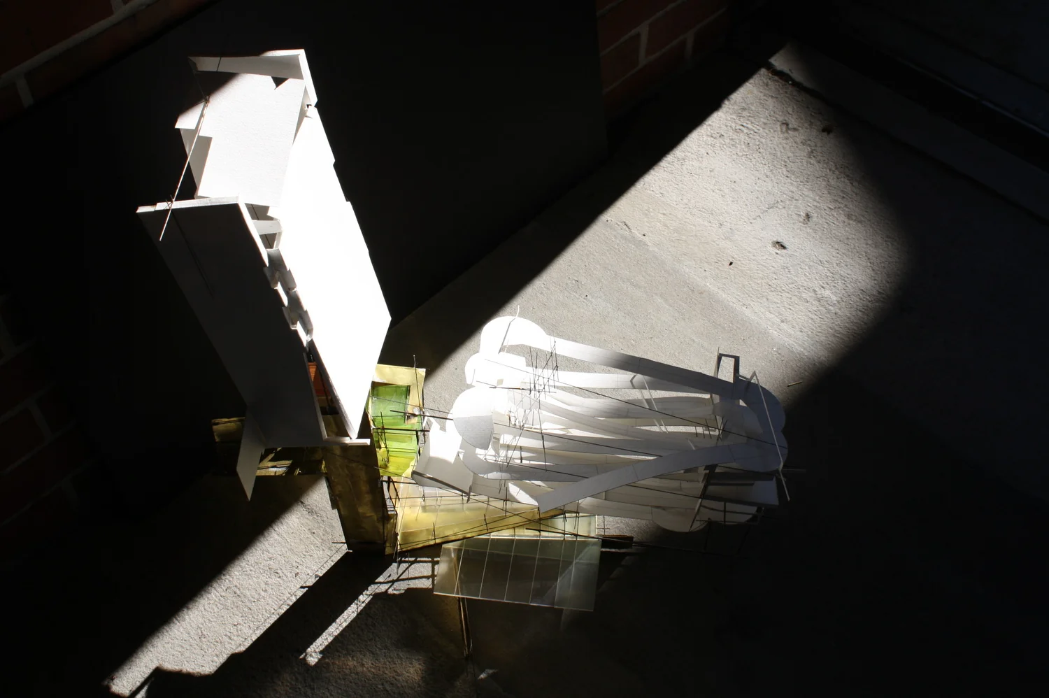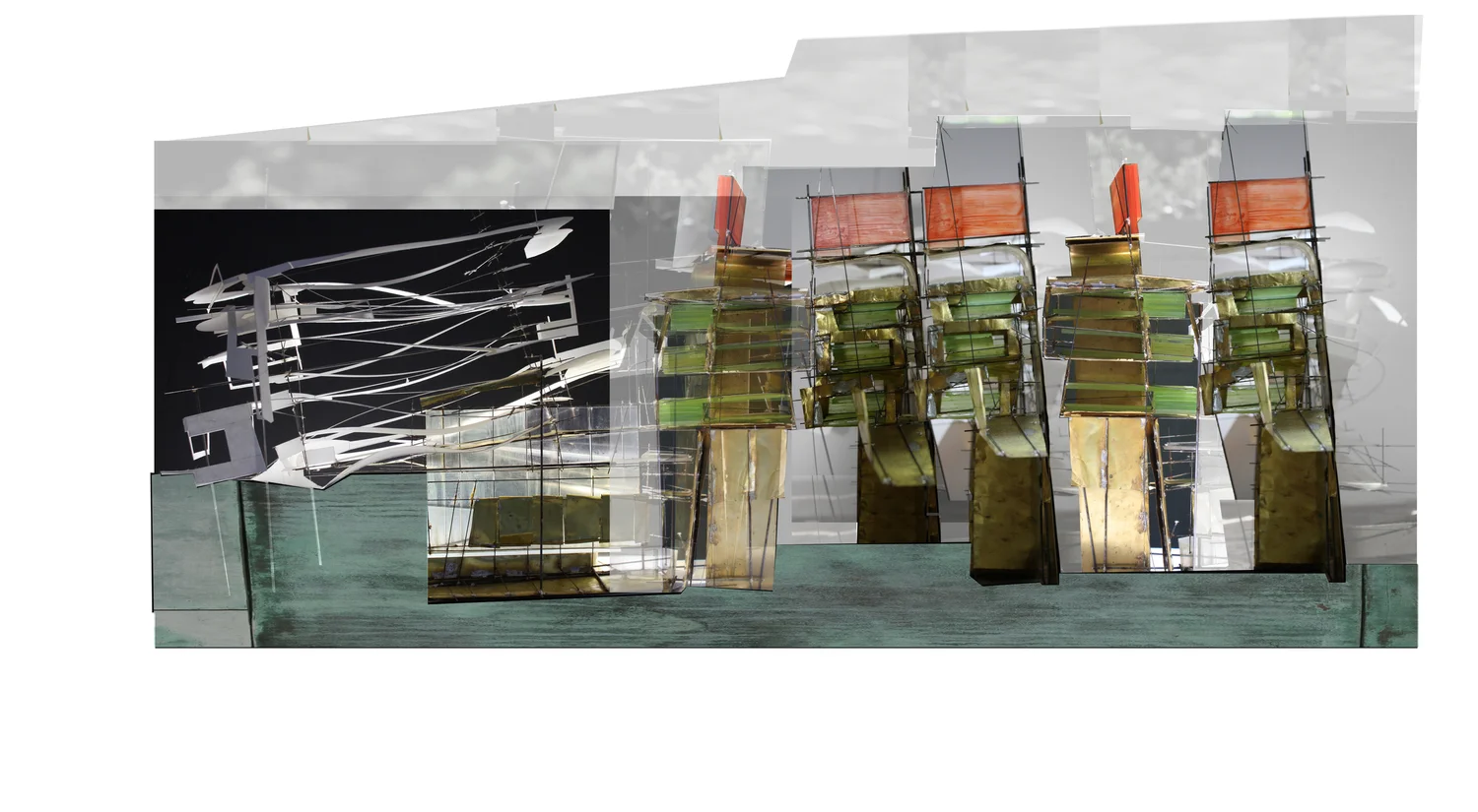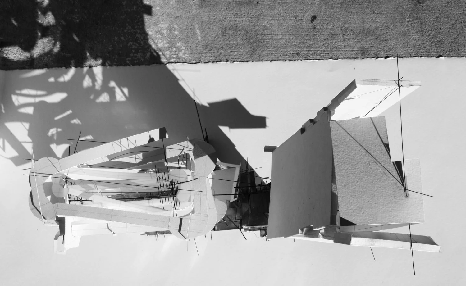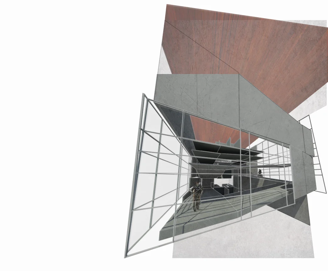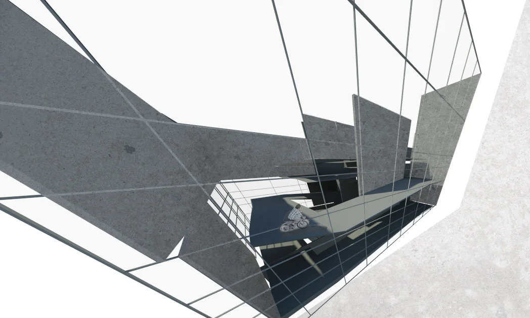 of biking facility. the first extraction is the parking area for bikes that include cafés; the second extraction is the art walls that build the facilities core; the third extraction isolates the ramps of mountain-grade slopes.