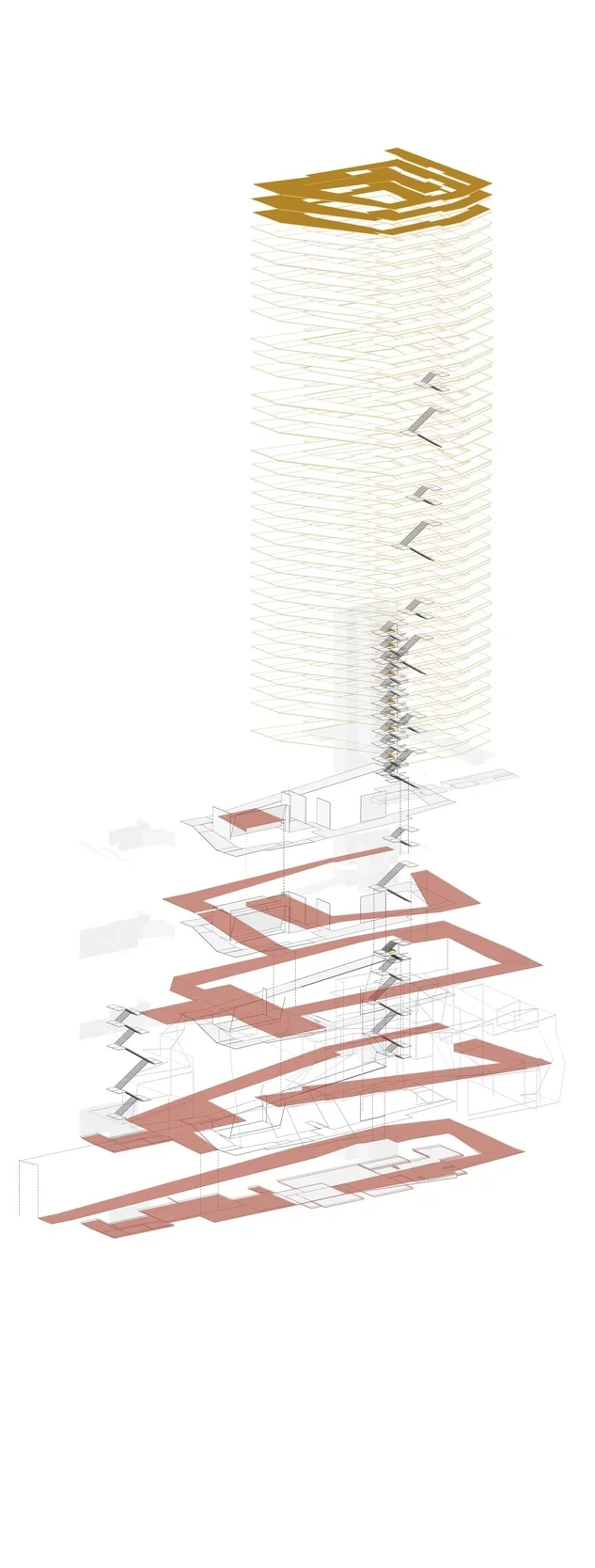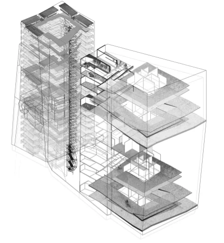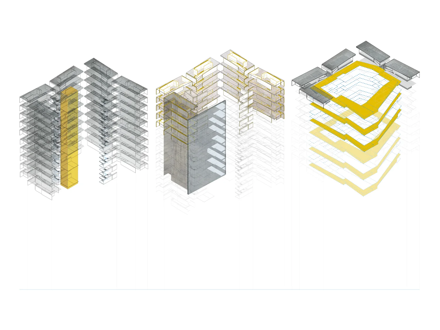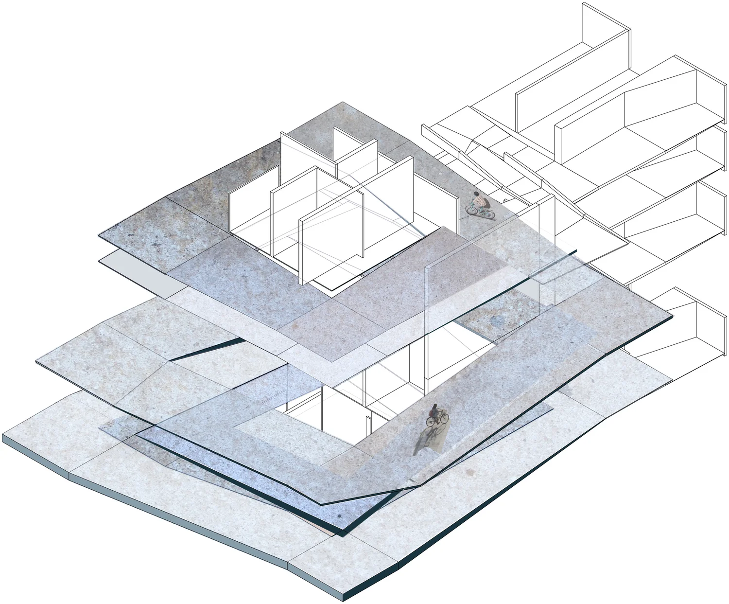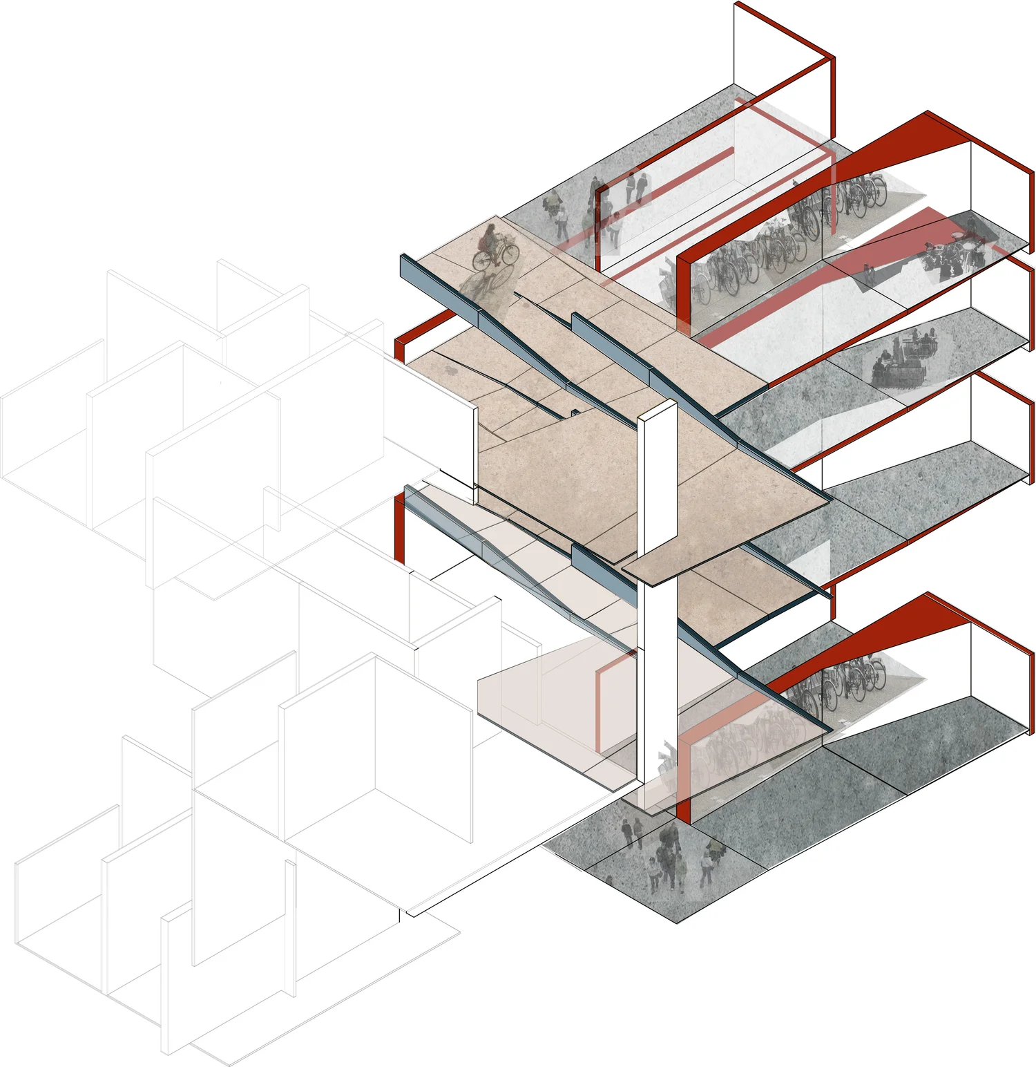 [2] axonometric idea of systems of housing units, circulation, and ramps