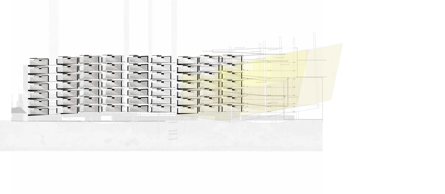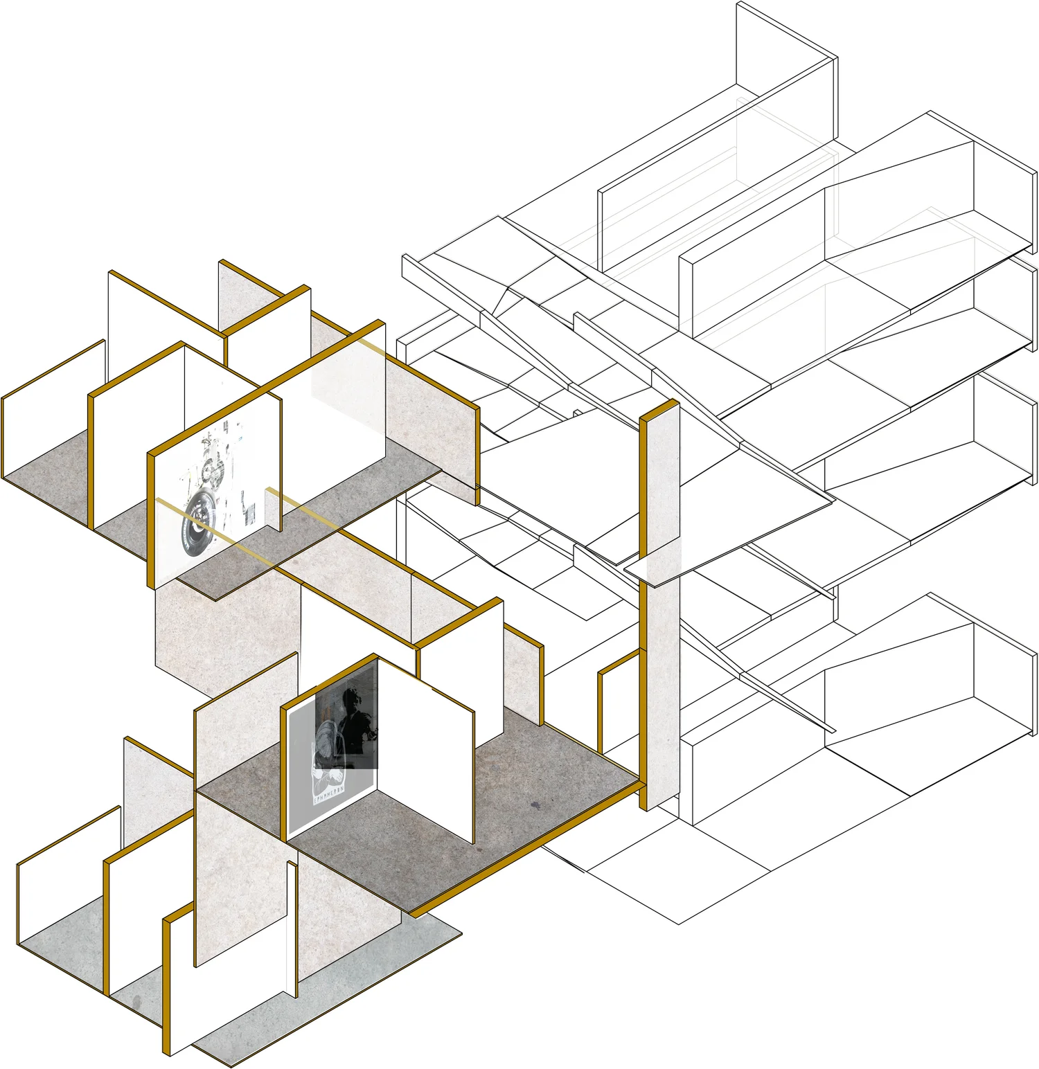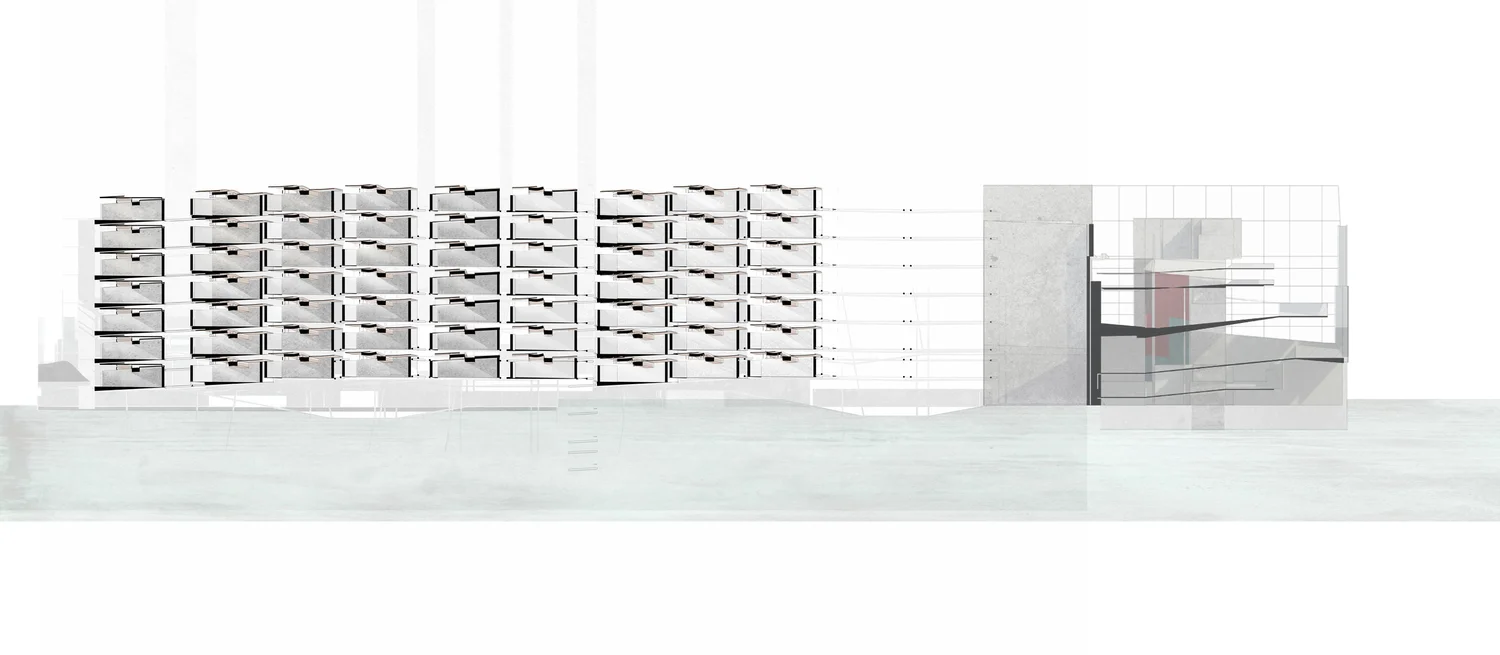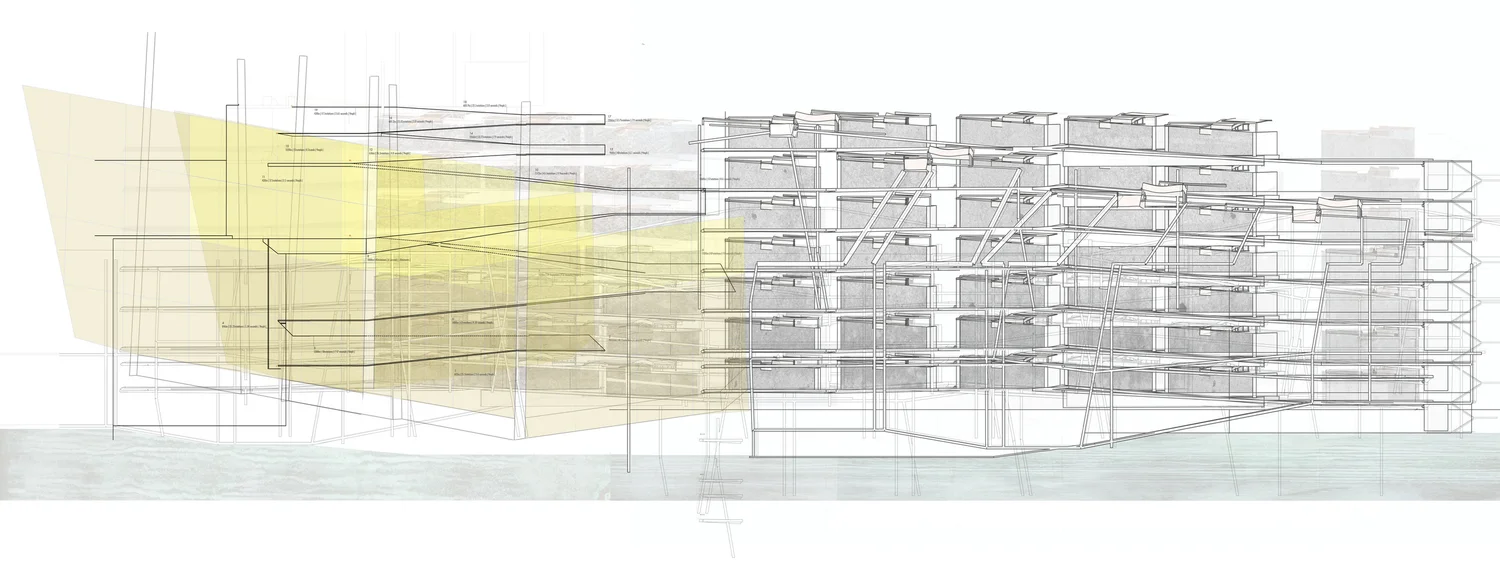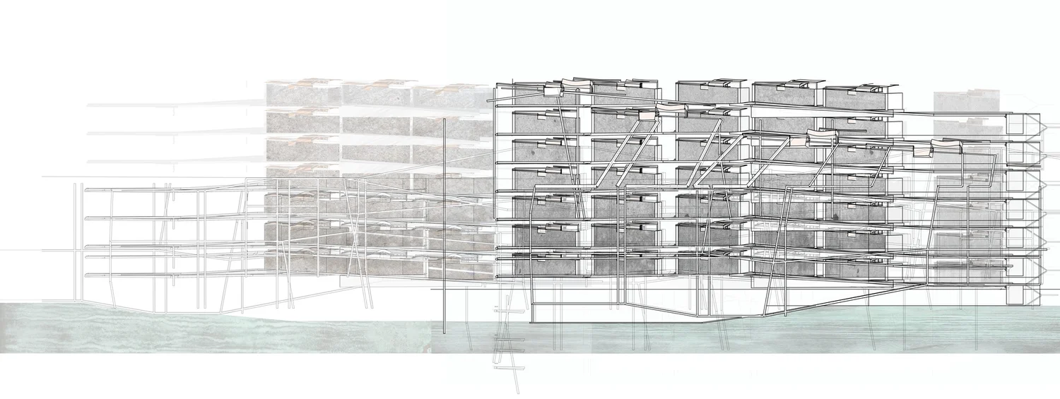 [2] axonometric idea of systems of housing units, circulation, and ramps