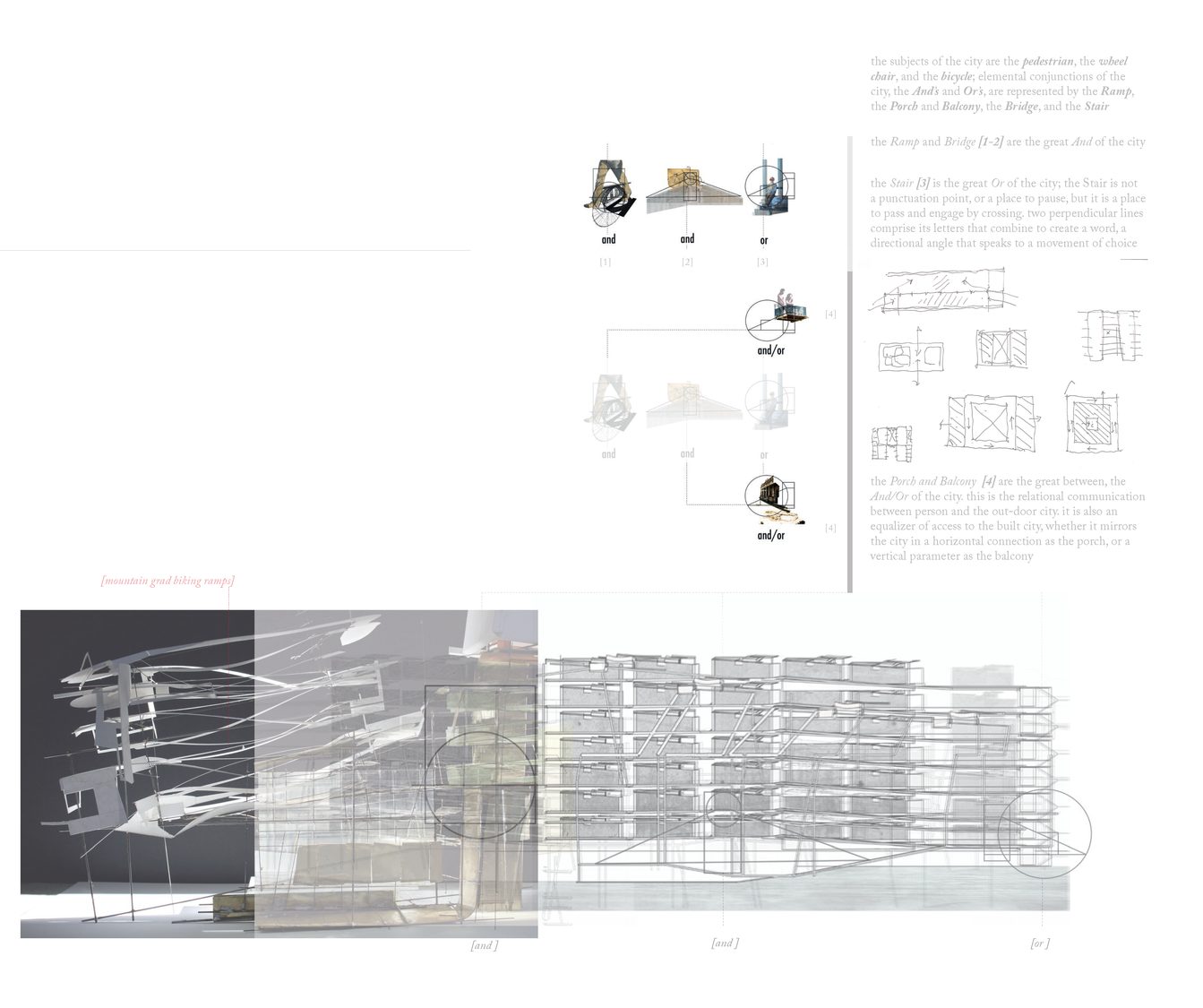 the Porch and Balcony are the great between, the And/Or of the city. this is the relational communication between person and the out-door city. it is also an equalizer of access to the built city, whether it mirrors the city in a horizontal connection as the porch, or a vertical parameter as the balcony | the Stair is the great Or of the city; the Stair is not a punctuation point, or a place to pause, but it is a place to pass and engage by crossing. two perpendicular lines comprise its letters that combine to create a word, a directional angle that speaks to a movement of choice| the Ramp and Bridge are the great And of the city|