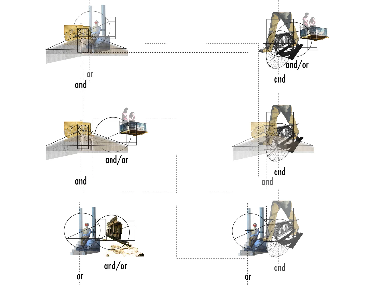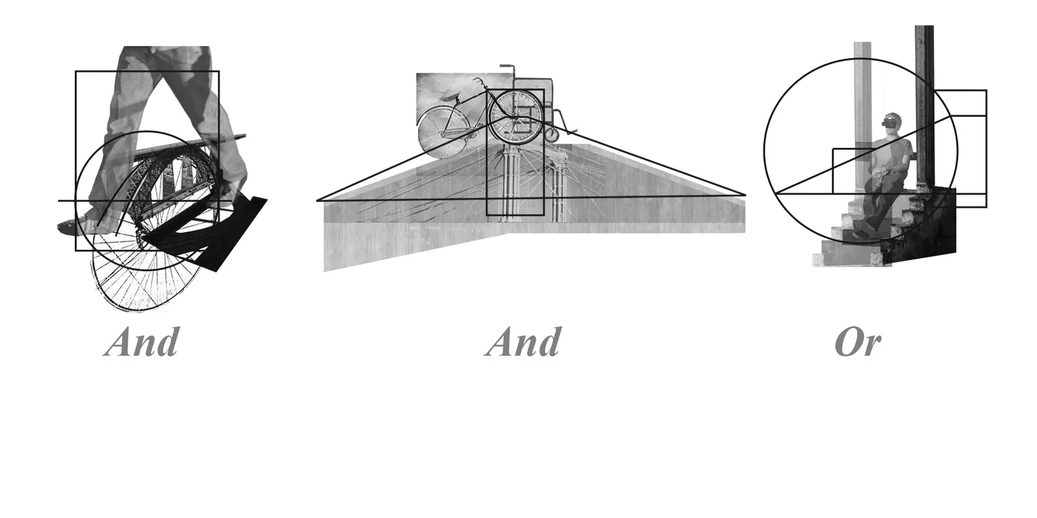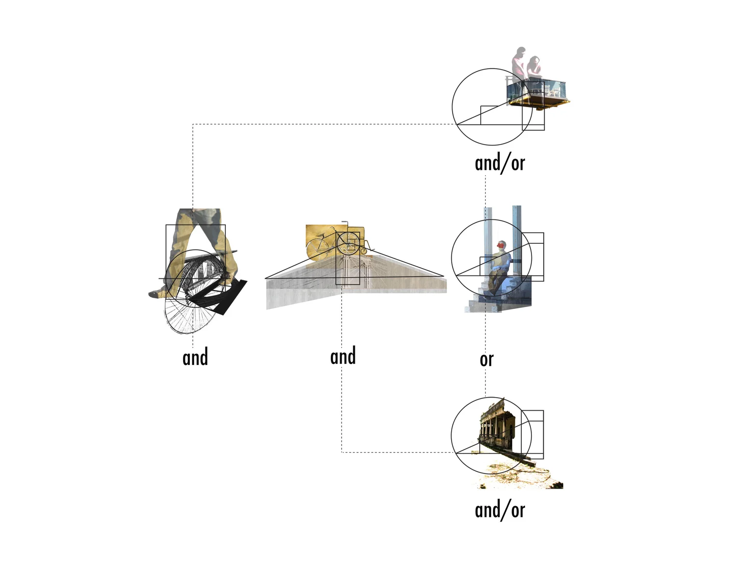 the subjects of the city are the pedestrian, the wheel chair, and the bicycle; elemental conjunctions of the city, the And’s and Or’s, are represented by the Ramp, the Porch and Balcony, the Bridge, and the Stair