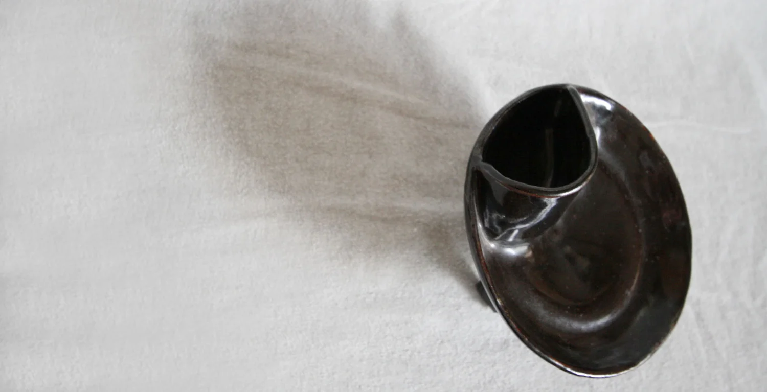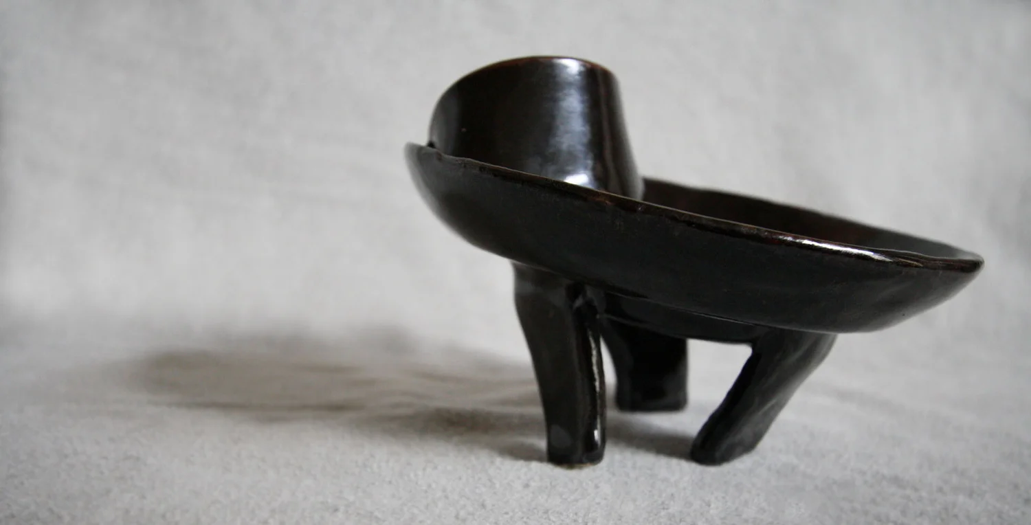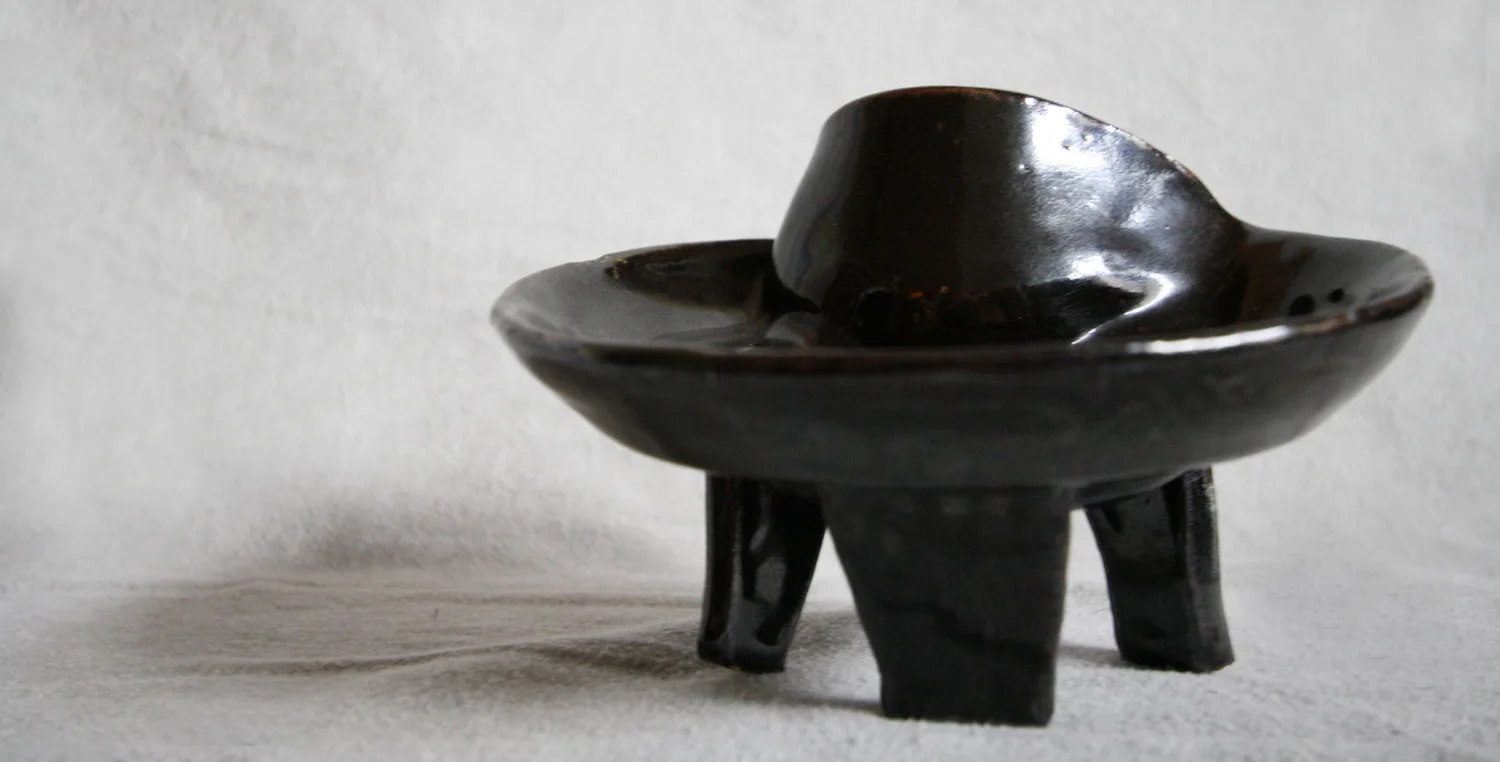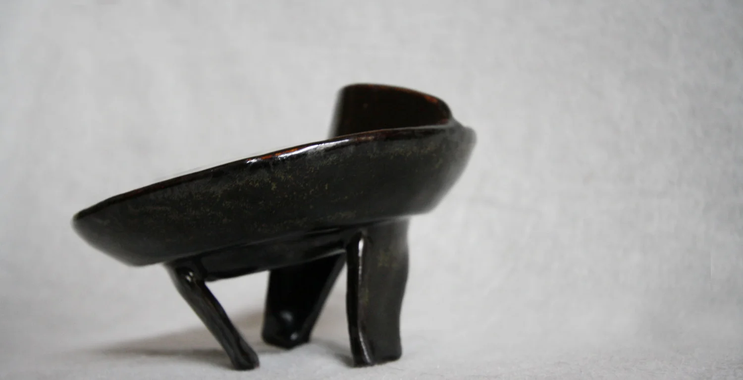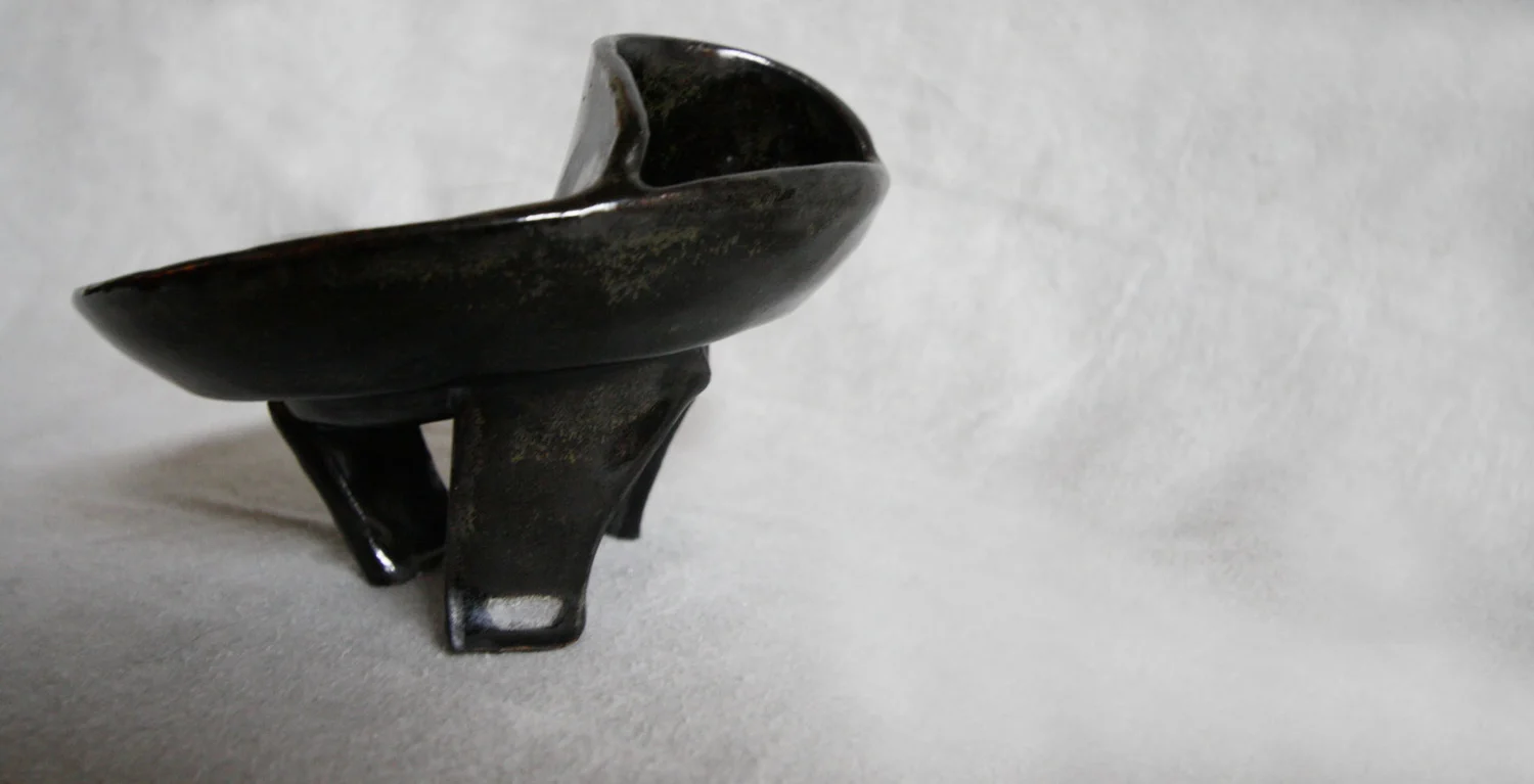 [22-23] a small, ovular bowl finds duality in its three-dimensional form and its two-dimensional glazing. its ovular form is sectioned by a flat slab; the shining black glaze is the opposing form to its naked clay finish above
