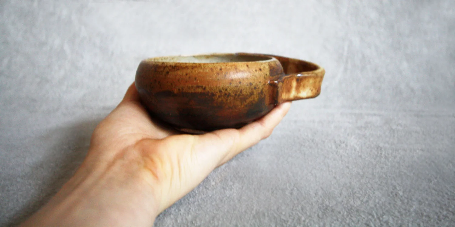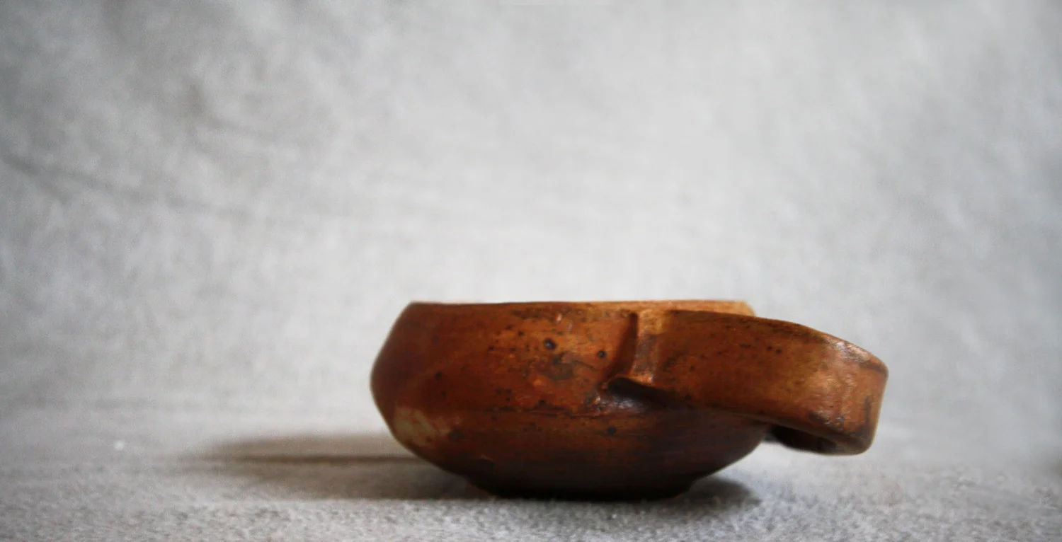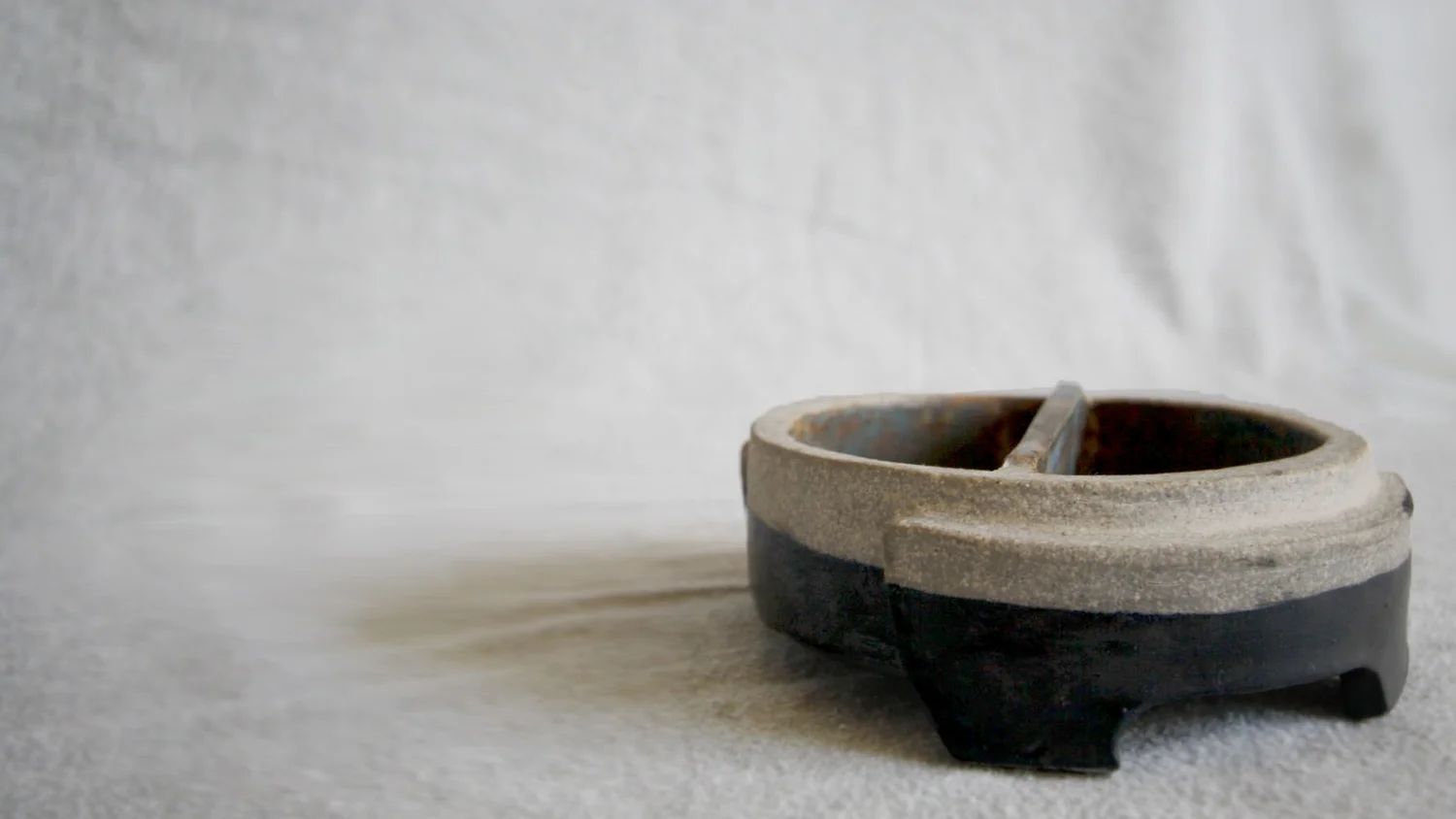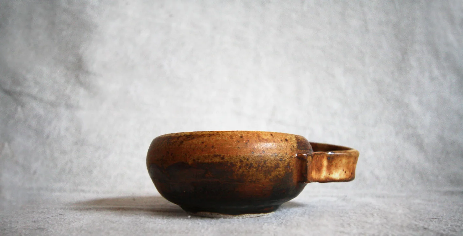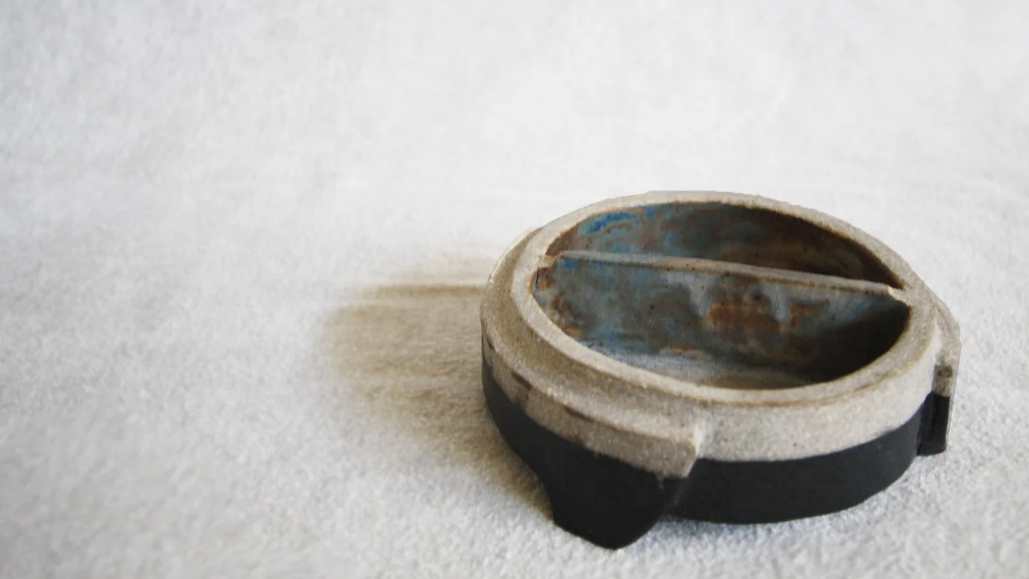 [22-23] a small, ovular bowl finds duality in its three-dimensional form and its two-dimensional glazing. its ovular form is sectioned by a flat slab; the shining black glaze is the opposing form to its naked clay finish above