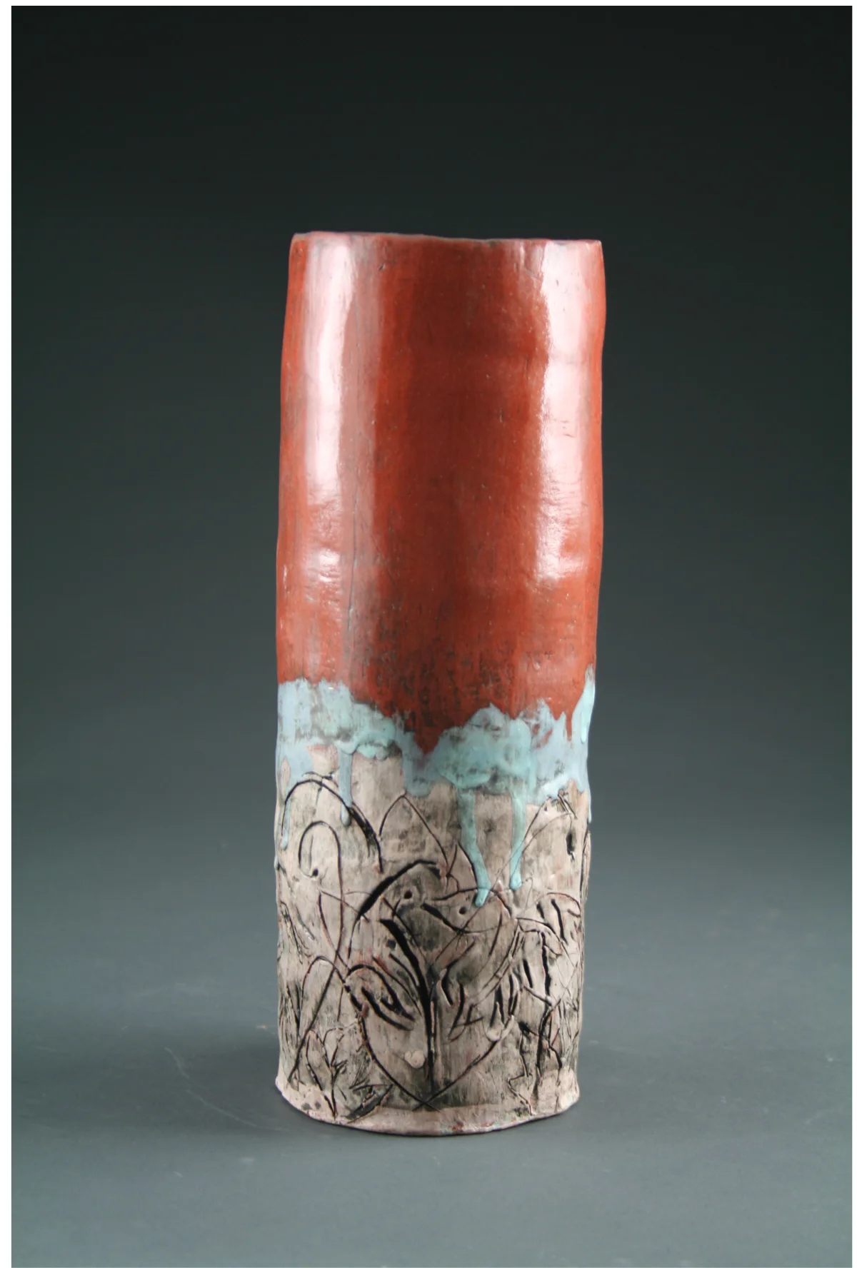 [25] the tall vase is constructed through the coil-pot method. the upper part is distinguished by a rustic, weathered formulation of glazing and etchings in the terra-cotta; the lower part is marked by etchings of flora and fauna on a soft matt blush glaze