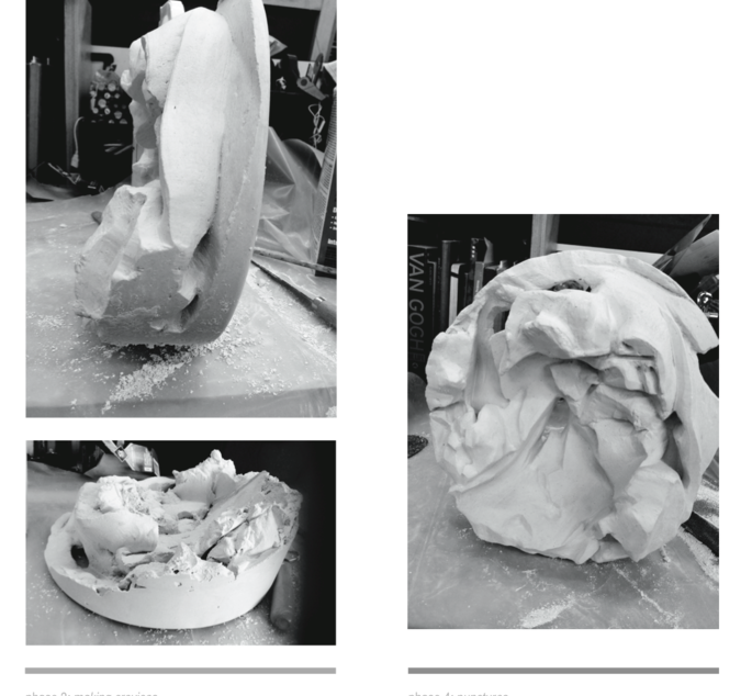 carving pushes beyond the tangent union of hand-to-material boundaries through a process of pressing and pulling of the surface. pressing and pulling lift lines and create spaces for light and shadow. this process is achieved through hard material, such as set plaster