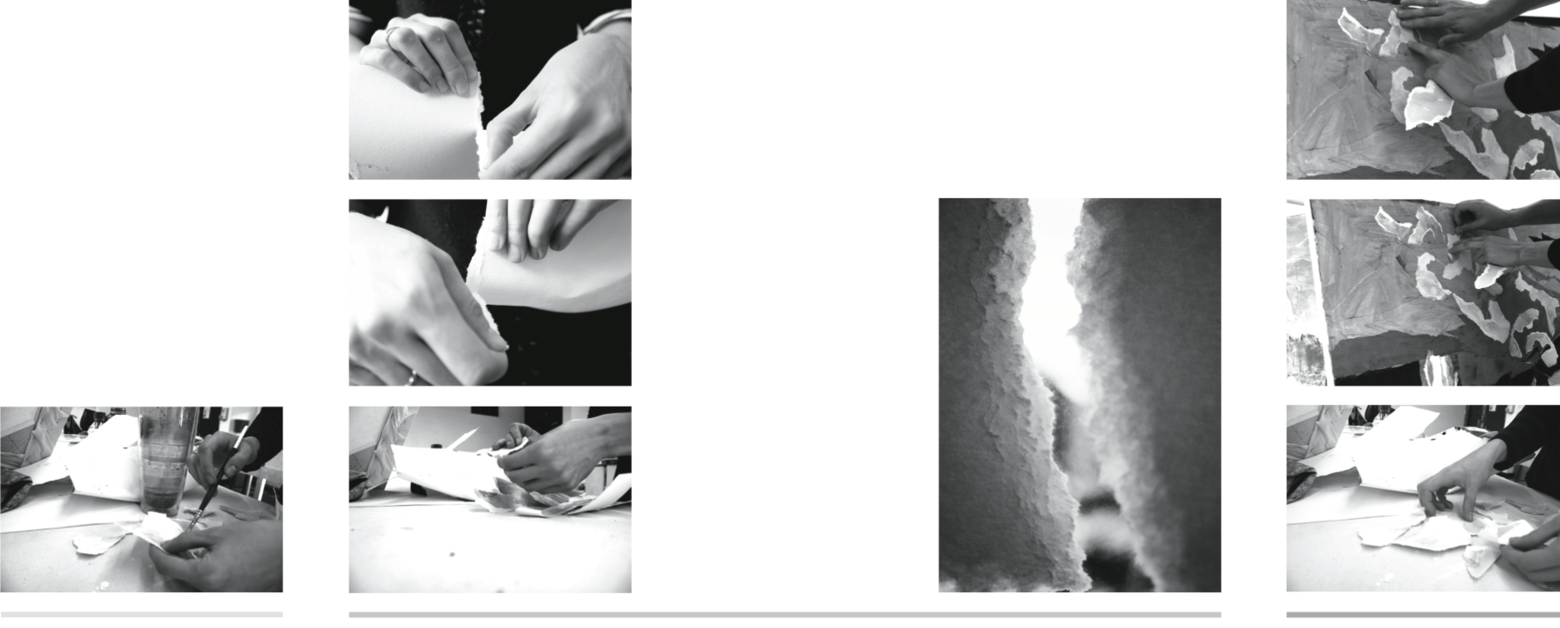 silhouettes and spots multiply through shaping and molding with the hands. when the paper is ripped towards the maker from the top, a larger and more opaque white, furry edge appears and washes away color residue; if paper is torn away from the maker and under itself, a thin, semitransparent edge forms.
