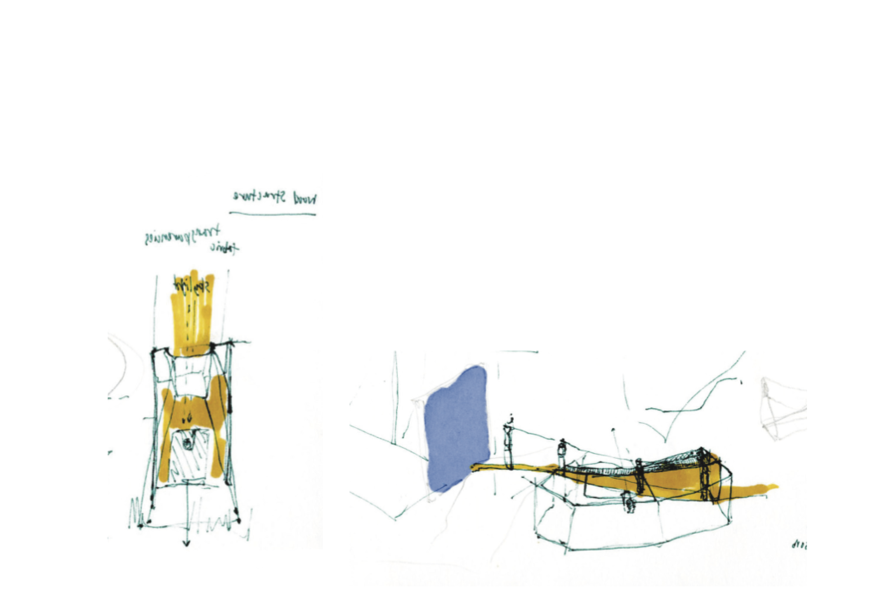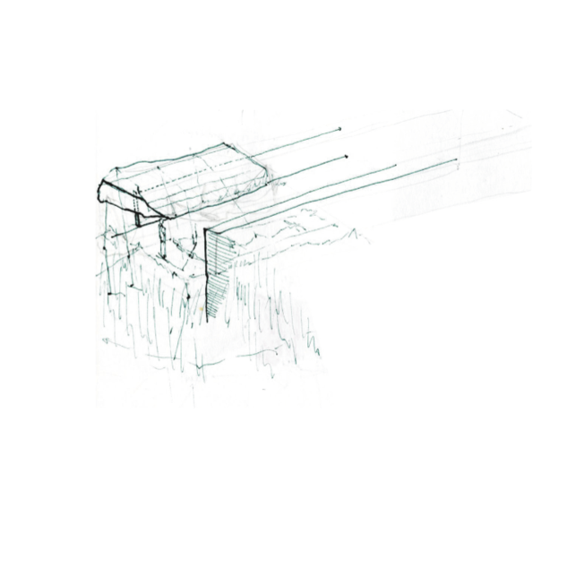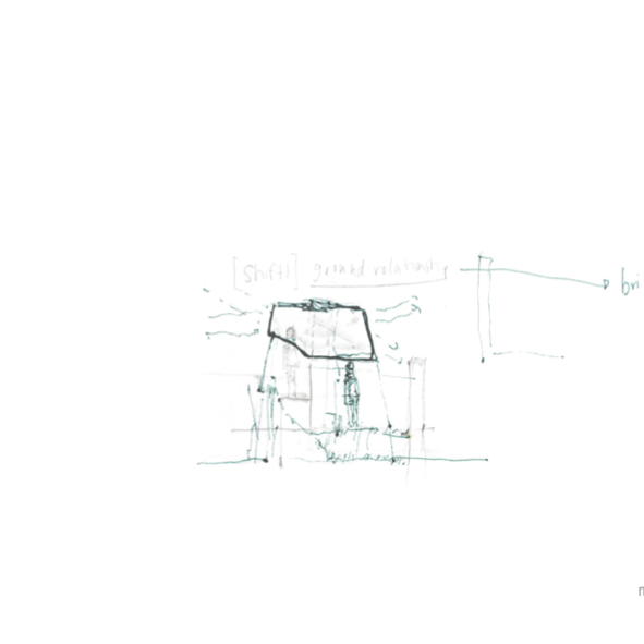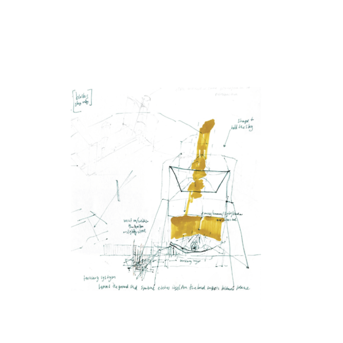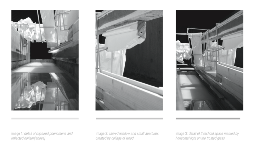 [20] the light enters through a sky oculus of cloth and is filtered into the space of the occupant. because the occupant is cradled in a hammock structure, it is a place of horizontal occupation, but vertical viewing. this collision of axes interaction results in a small light-place of occupation. the upper light-place of sky oculus collects leaves, sky, light, and shadow. the viewed horizon is limited to the moment of land, the solid-horizon, meeting sky, the ephemeral-horizon. as the occupant is in a horizontal position, the solid-horizon also become a tactile moment